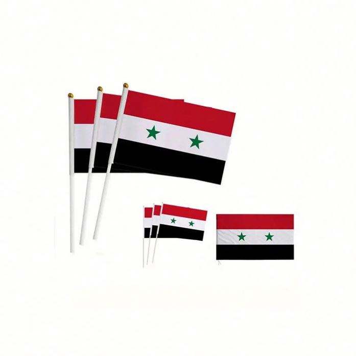 ธงชาติซีเรียแบบถือมือพร้อมเสา ธงโพลีเอสเตอร์สีแดง ขาว ดำ เขียว ลายดาว ขายส่ง