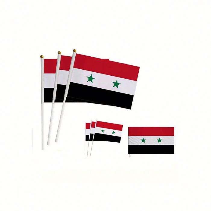 ธงชาติซีเรียแบบถือมือพร้อมเสา ธงโพลีเอสเตอร์สีแดง ขาว ดำ เขียว ลายดาว ขายส่ง