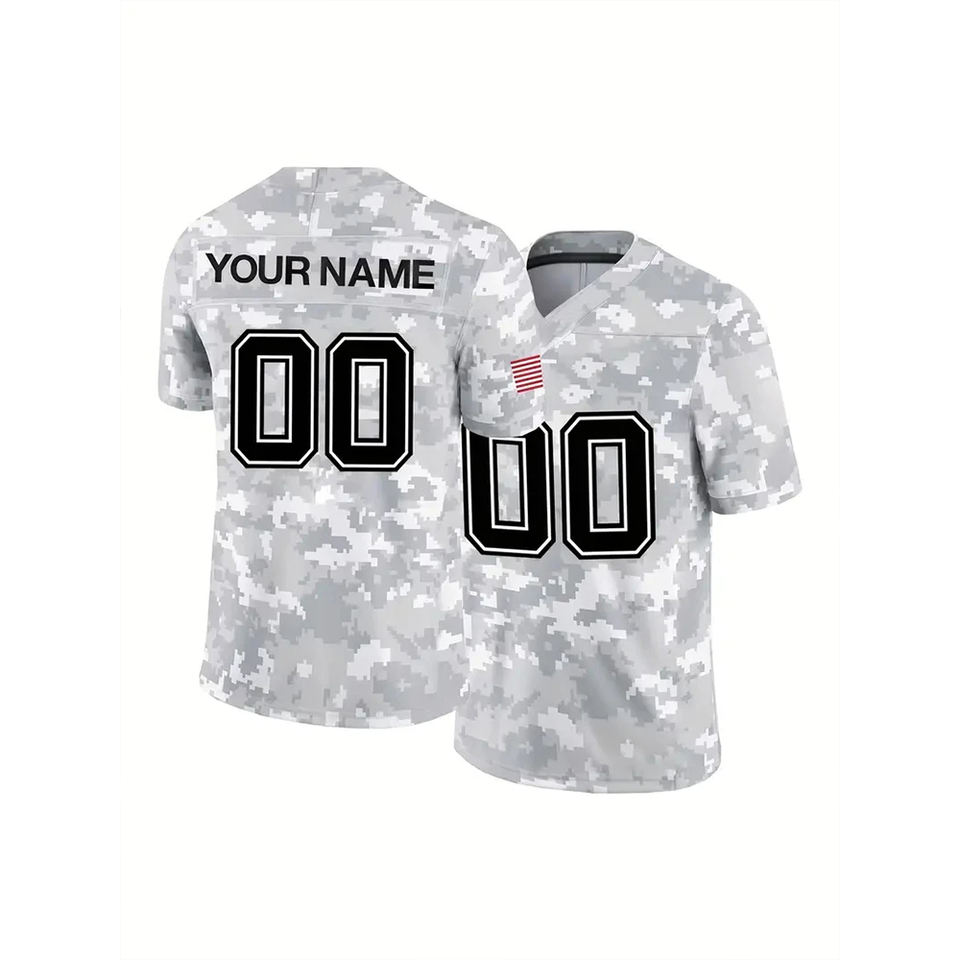 เสื้อฟุตบอลคอวีแบบอเมริกันแขนสั้นพิมพ์ลายซับลิเมชันโพลีเอสเตอร์ออกแบบได้ตามต้องการ