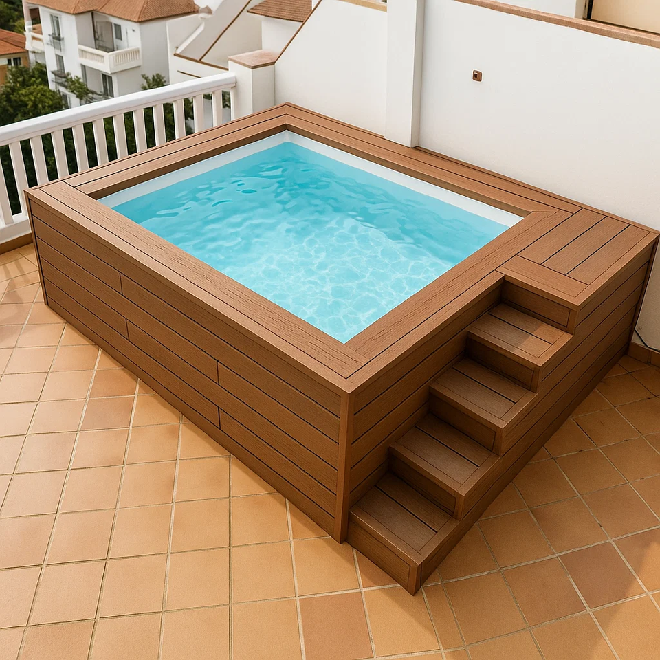 บ้าน ครอบครัว ไม้ สระว่ายน้ำเหนือพื้นดิน ผนังอะคริลิกแก้ว สระว่ายน้ำหรูหราเหนือพื้นดิน สระว่ายน้ำบนดาดฟ้า สระว่ายน้ำไฟเบอร์กลาส