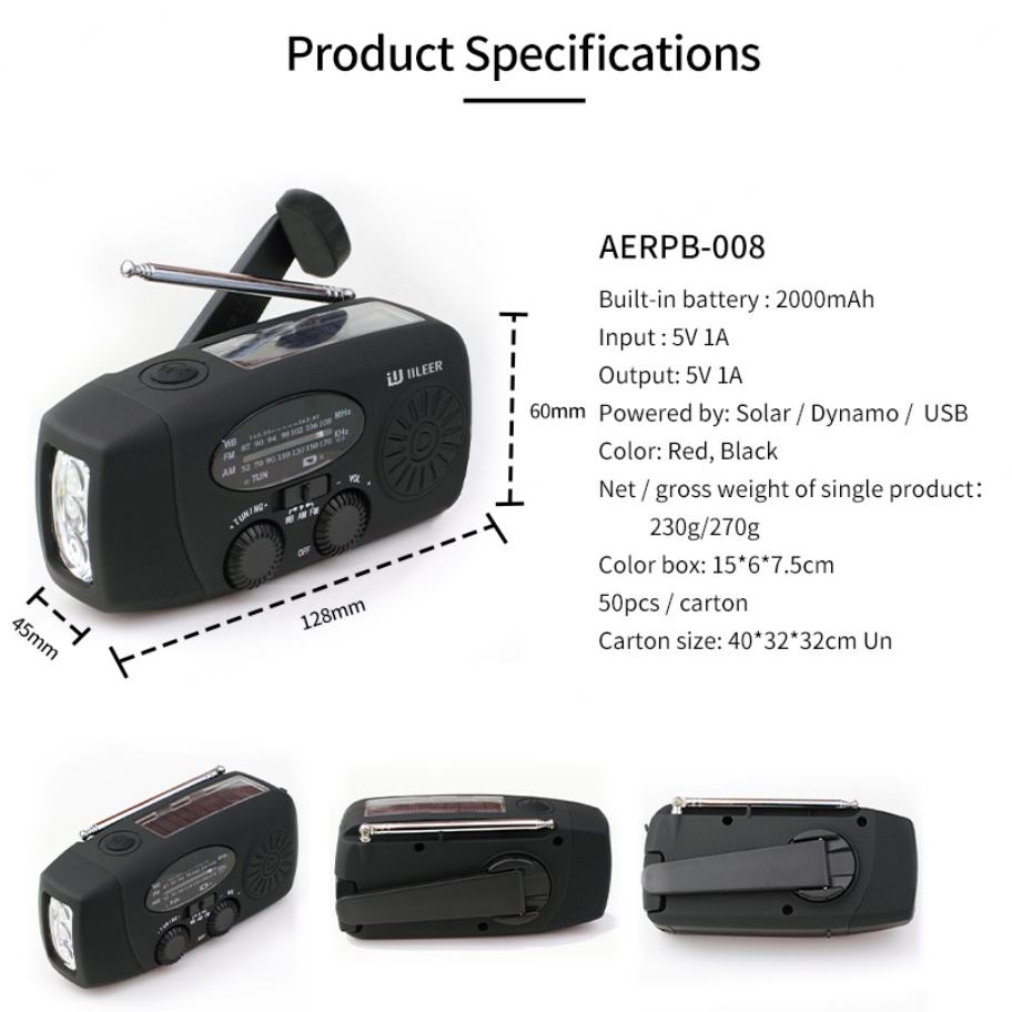 วิทยุพกพาฉุกเฉินแบบมือหมุนพร้อมไฟฉายโซลาร์เซลล์และที่ชาร์จโทรศัพท์มือถือสำหรับป้องกันภัยพิบัติ ขายส่ง