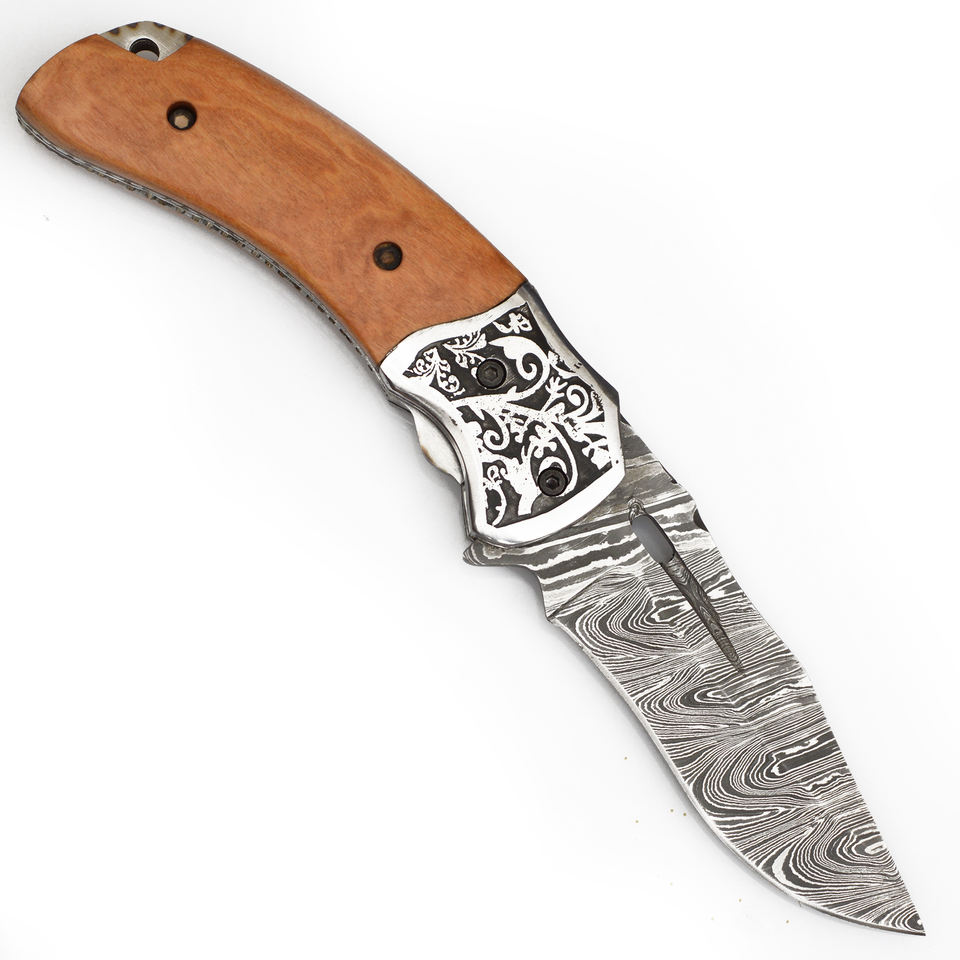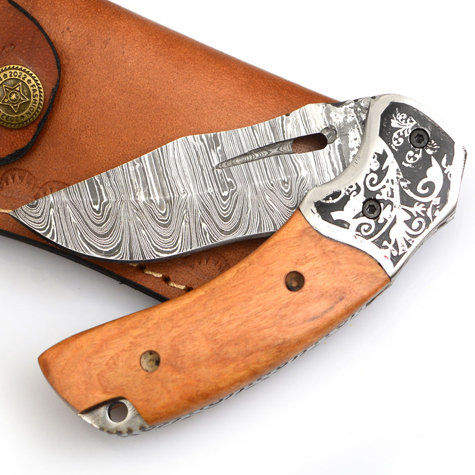 Wholesale Portable Handmade Damascus Steel Pocket Folding Blade Knife With Wood Handle and Leather Pouch Pocket Knives.