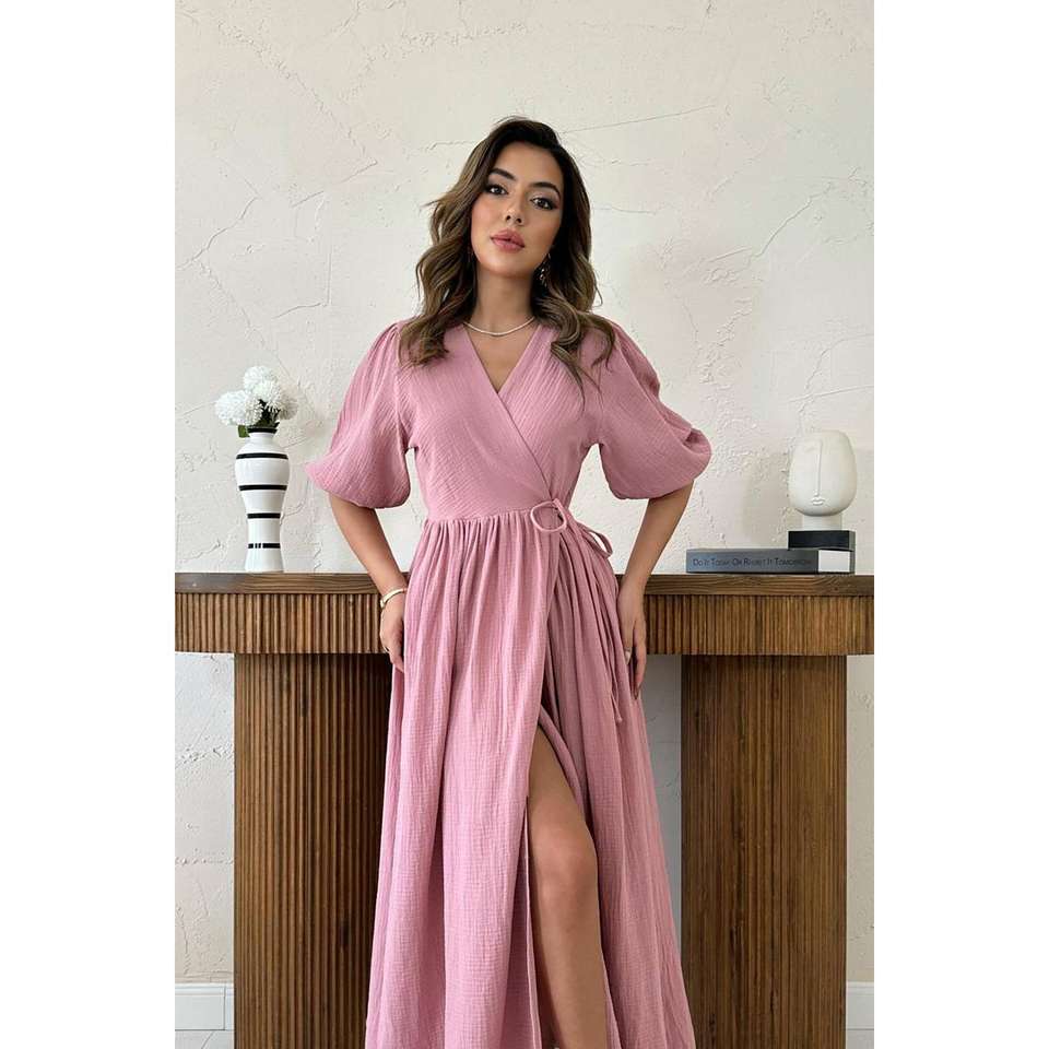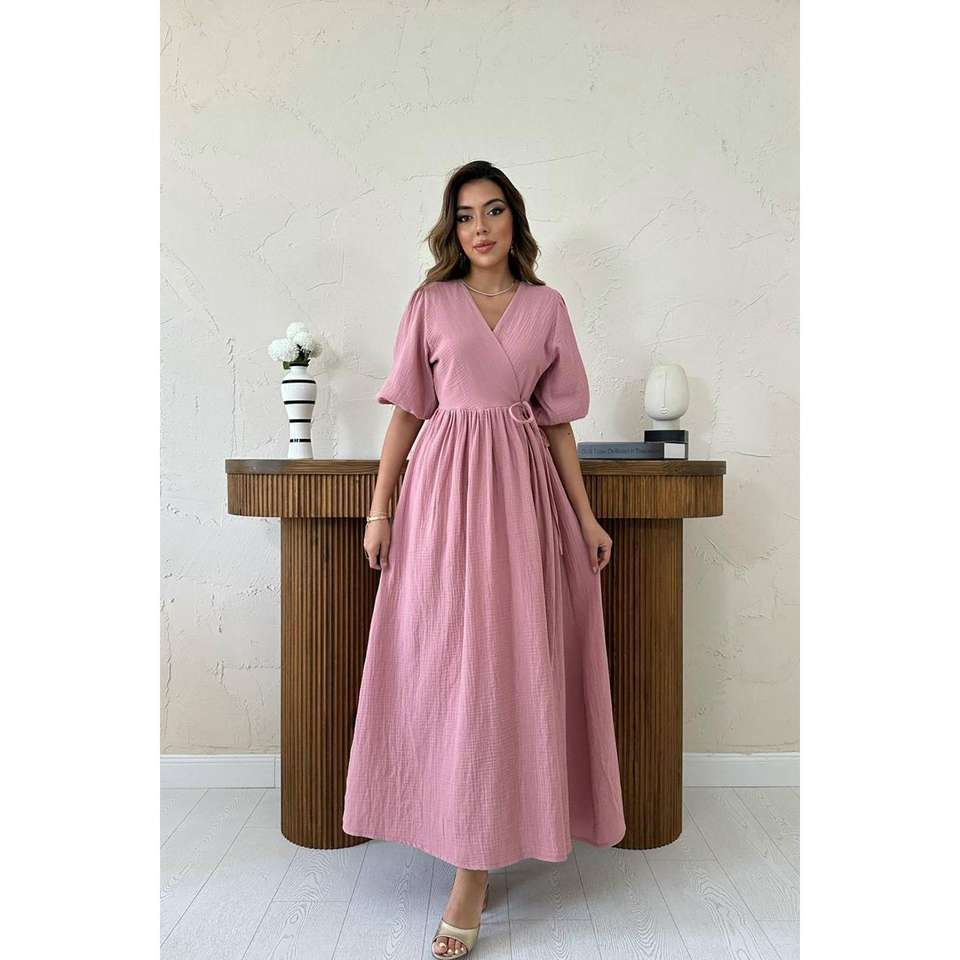 เดรสยาวผ้ามัสลินสีชมพูพาสเทล คอวี ผูกเอว ทรงหลวม ระบายอากาศดี ใส่สบายๆ สำหรับทุกวัน ขายส่ง