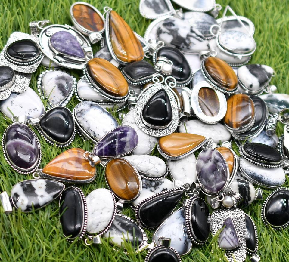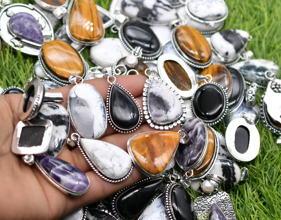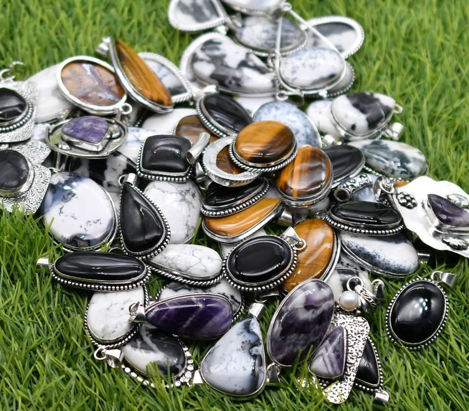 จี้หินผสมสไตล์คริสเตียนวินเทจขายส่ง พรีม บายา - ไทเกอร์อาย อะเมทิสต์ ฮาวไลท์ - ชุบเงินโบราณ