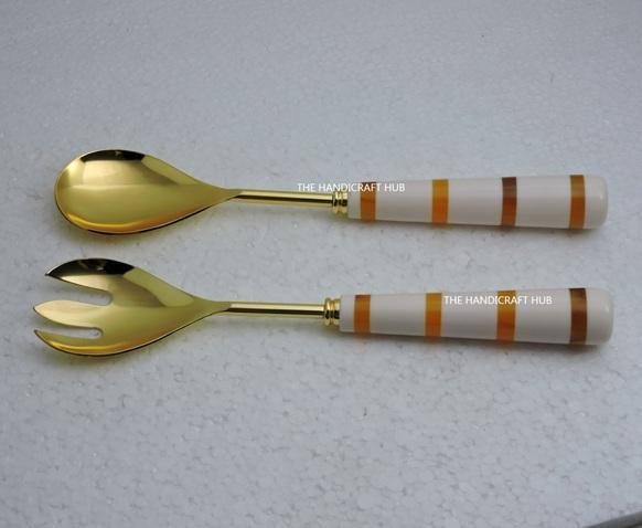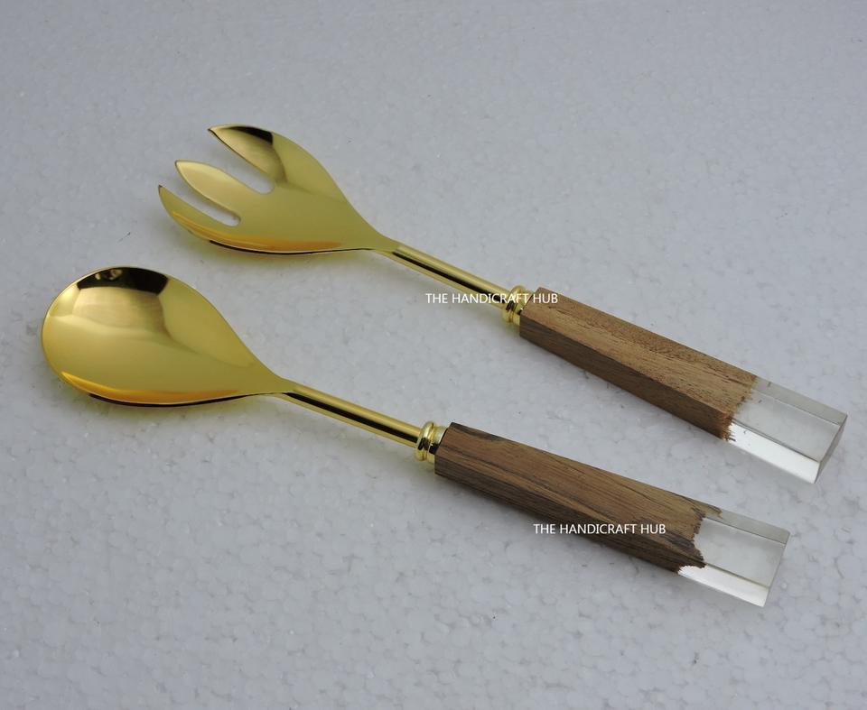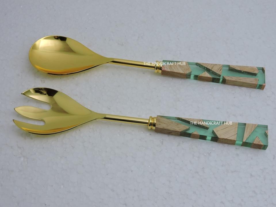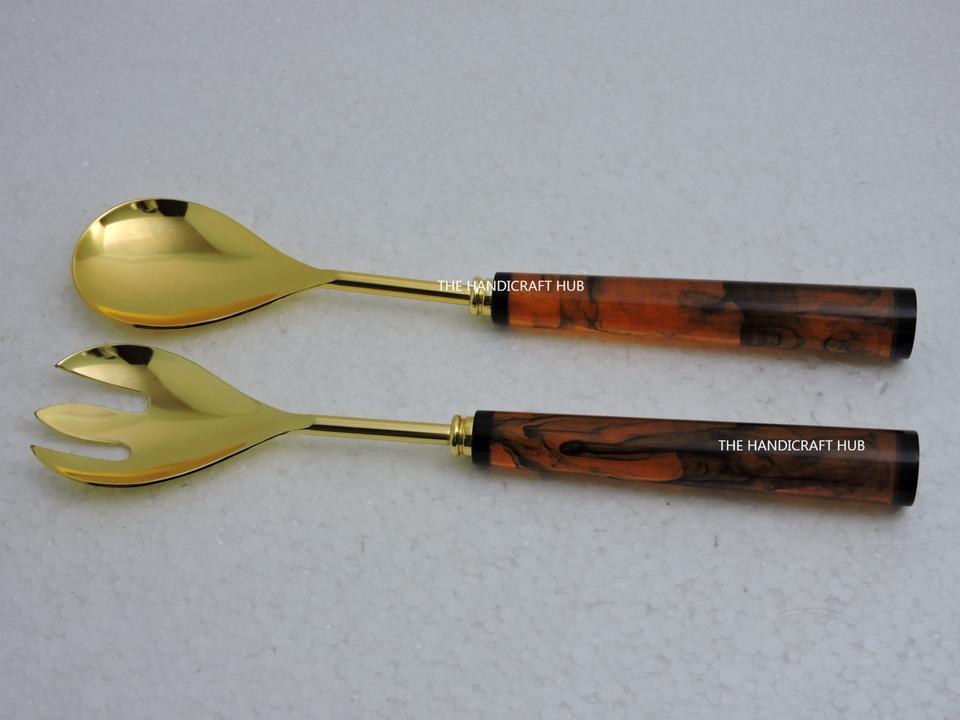 ชุดช้อนส้อมคุณภาพพรีเมียมขายส่งจากอินเดีย ดีไซน์ใหม่ ช้อนสลัดโลหะชุบทอง ด้ามจับเรซิ่นใส 2 ชิ้น ช้อนส้อมสำหรับอาหาร