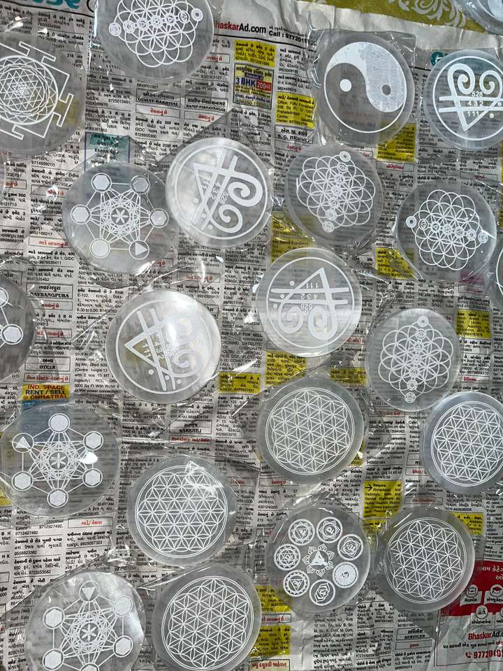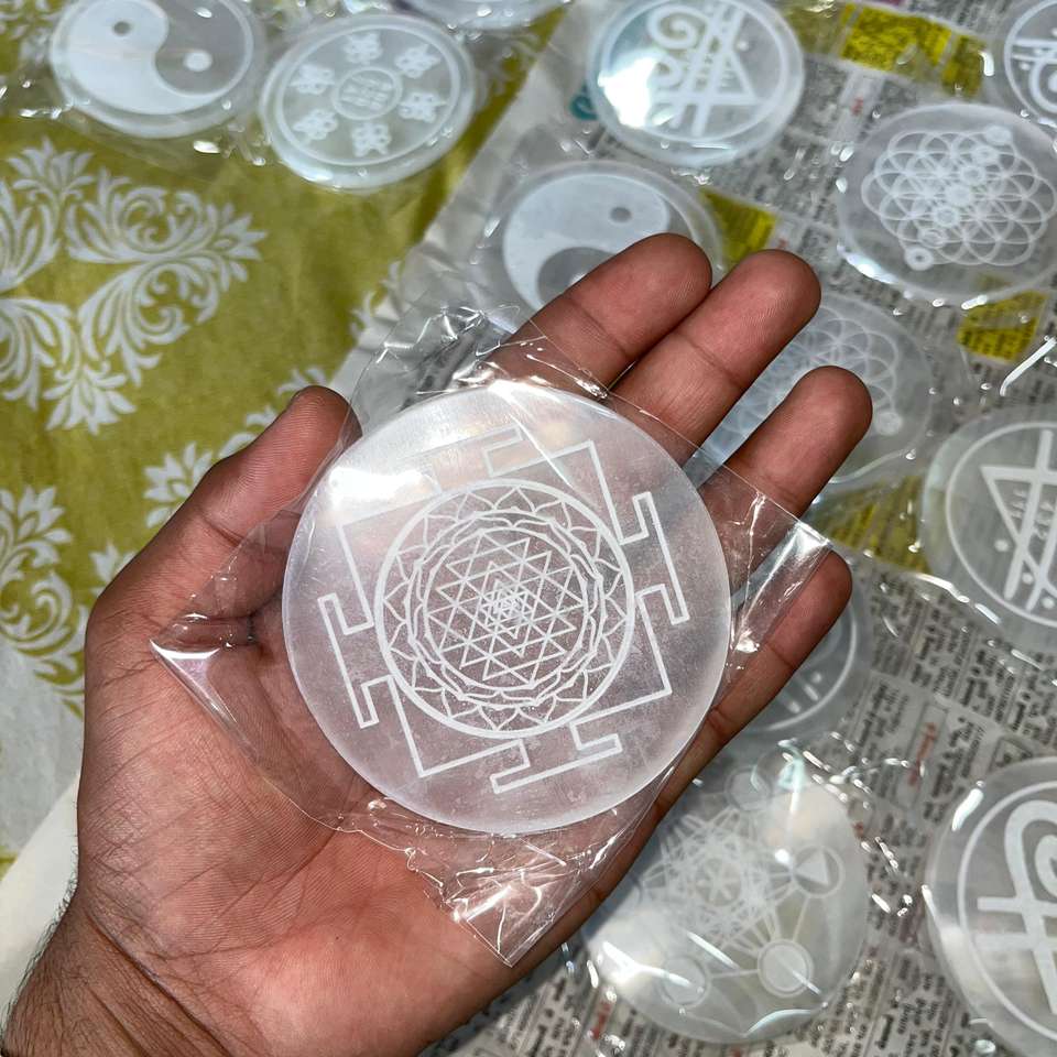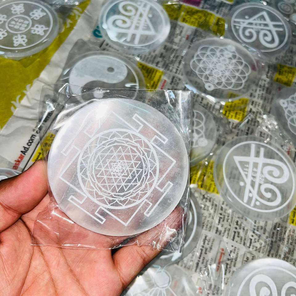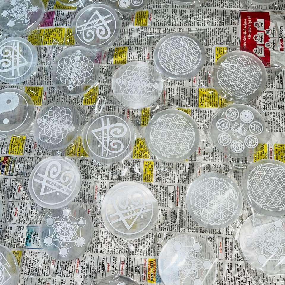 แผ่นเซเลไนต์สีขาวขายส่ง สลักลายข้างขึ้นข้างแรม รูปทรงกลมขัดเงา สำหรับบำบัดและชาร์จพลังงาน รับสั่งทำตามแบบ