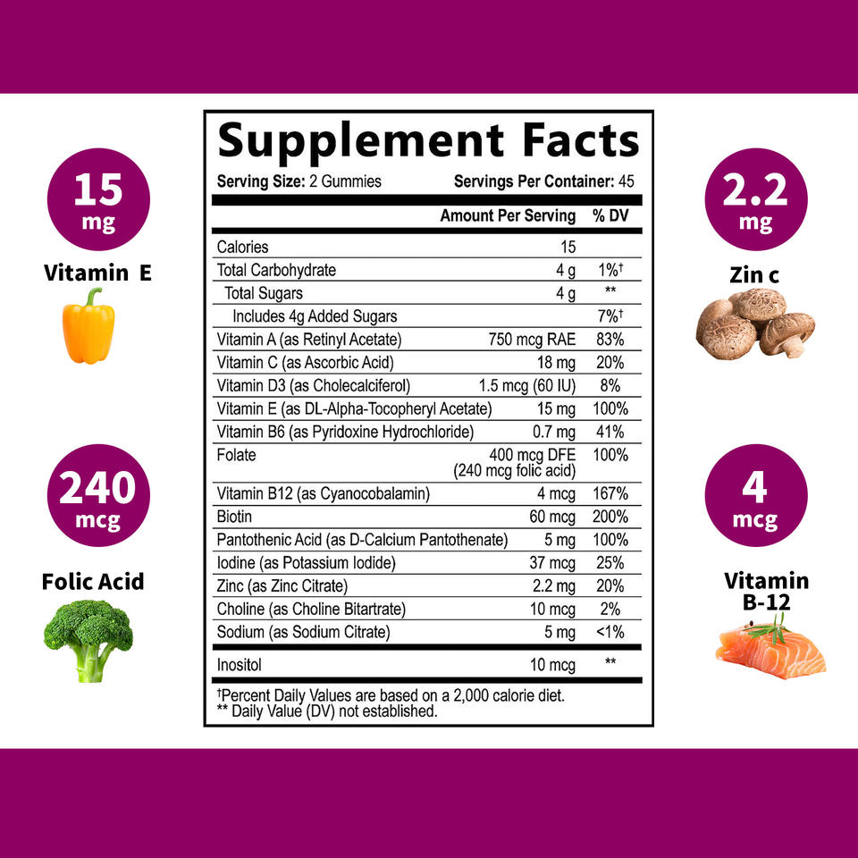 วิตามินเอ, วิตามินซี, วิตามินอี, วิตามิน B6, โฟเลต, วิตามิน B-12, ไบโอติน, กรดแพนโทธีนิก, โซเดียม, อินโนซิทอล, วิตามิน D3, สังกะสี, โคลีน, ไอโอดีนส่วนผสมหลัก