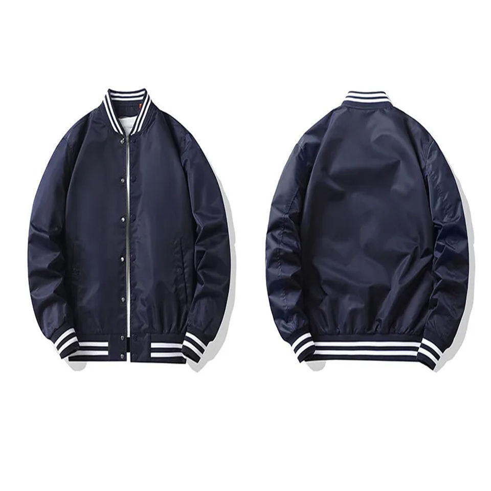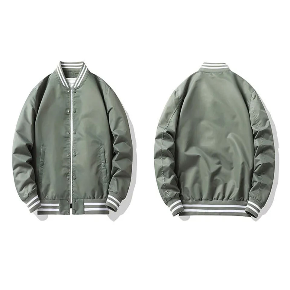 เสื้อแจ็คเก็ตบอมเบอร์สีพื้นเรียบแบบขายส่ง ปักโลโก้ด้วยผ้าเชนิลล์ตามสั่ง คุณภาพสูง เสื้อแจ็คเก็ตบอมเบอร์แบบติดกระดุม