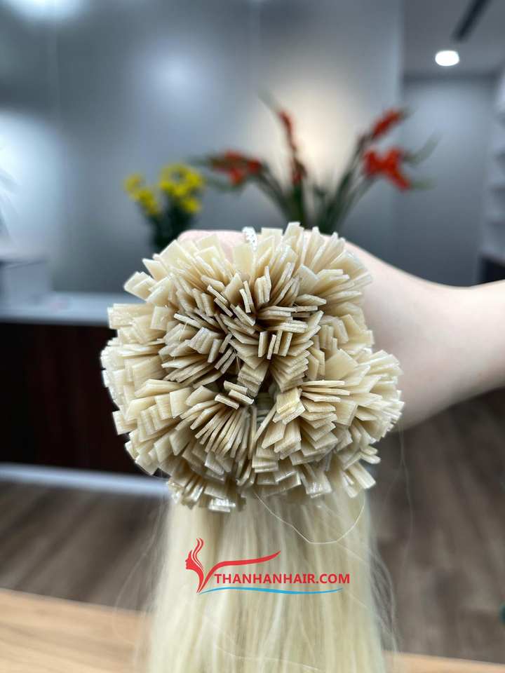 ผมมนุษย์ต่อผมมนุษย์แบบมีเคราตินอัดไว้ก่อนต่อผมปลายแบนผลิตจากเวียดนามสีบลอนด์
