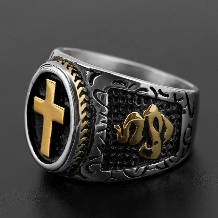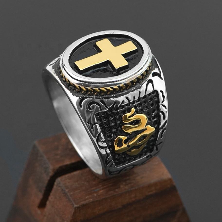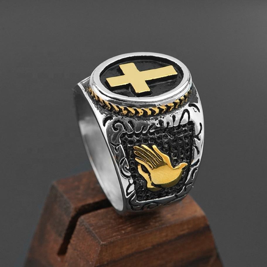 แหวนดีไซน์กากบาทราคาส่ง เครื่องประดับทางศาสนา ชุบทองสองสี แหวนนิ้วสไตล์พังก์สำหรับผู้ชาย