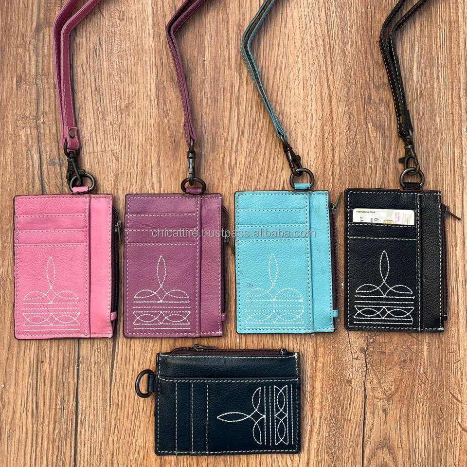 Wholesale Price Customized Boot Stitch Lady Card Holder Pouch RFID Genuine Leather Wristlet Coin Purse High Quality Slim Wallet