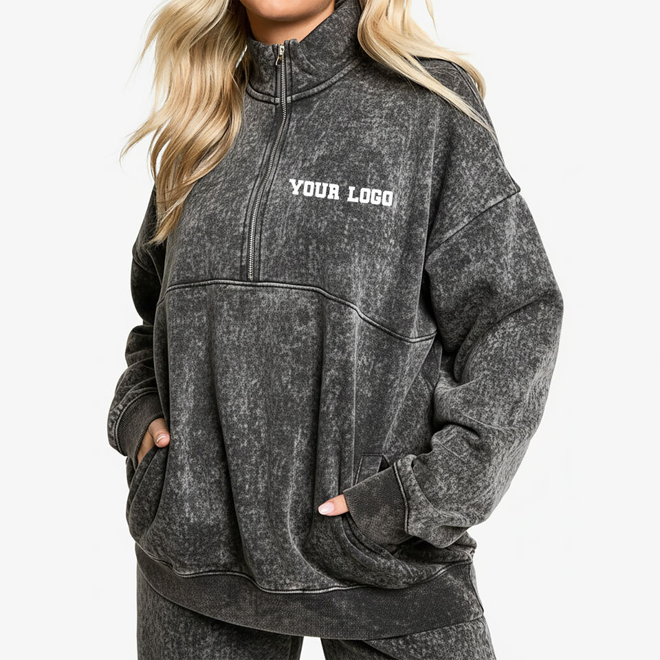 เสื้อสเวตเชิ้ตผู้หญิงคอตั้งแบบซิป ¼ ตัว ผ้าฝ้ายออร์แกนิคน้ำหนักมาก ซักกรด ทรงหลวม สำหรับฤดูหนาว ราคาขายส่ง