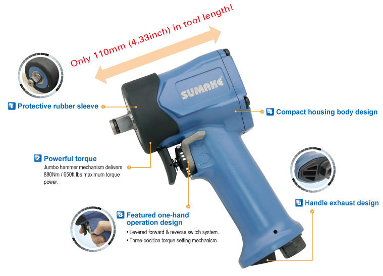 Sumake ประแจ3/8ขนาดเล็กหัวอัดอากาศแบบสั้นเครื่องมือลมที่มีการปรับแต่งได้