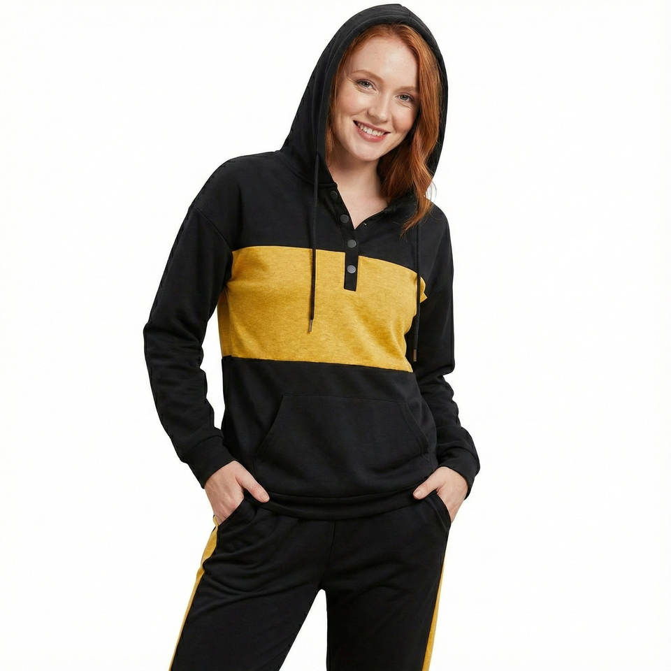 Wholesale Price Ladies Customized Color Block Hoodies Henley Neck Button Long Sleeve Casual Loose Fit Pullover Stylish Hoodies