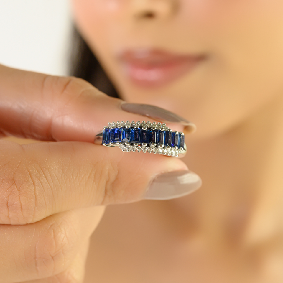 แหวนเพชรทรงบาแกตต์สีน้ำเงินแซฟไฟร์หรูหราและเพชรทรงกลมแบบซิกแซก ทองคำขาว 14K แท้ งานสั่งทำ ราคาขายส่ง