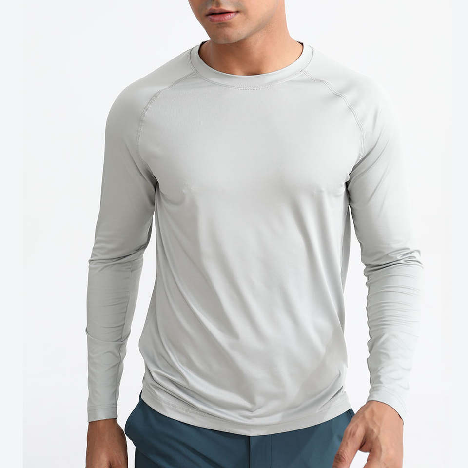 เสื้อยืดสตรีทแวร์แขนยาวของผู้ชายผ้าคอตตอนสีทึบเสื้อเจอร์ซี่พิมพ์โลโก้กำหนดเองแห้งเร็วระบายอากาศ