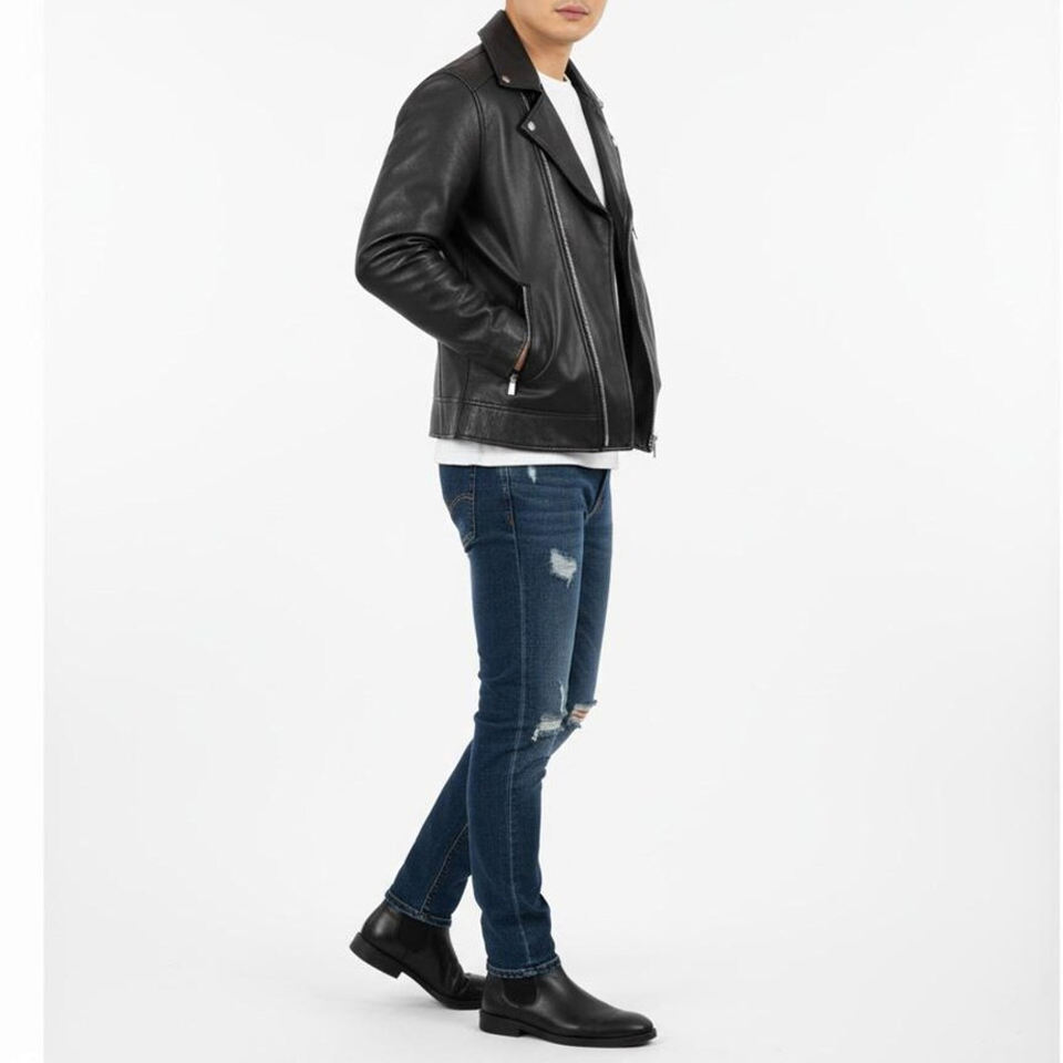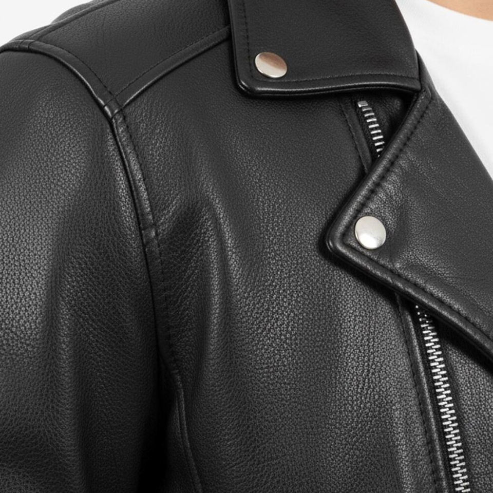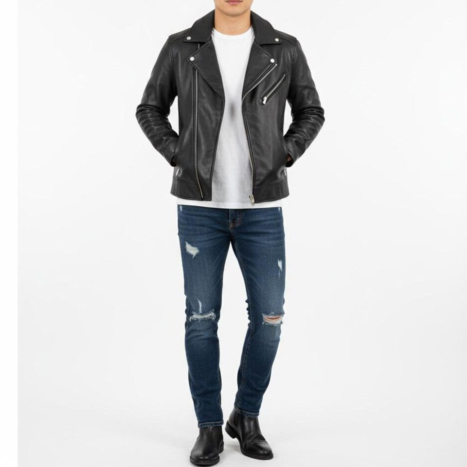 แจ็กเก็ตบุรุษหนังแกะสีดำสำหรับผู้ชายเสื้อแจ็คเก็ตขี่จักรยานออกแบบโลโก้ได้ตามต้องการ