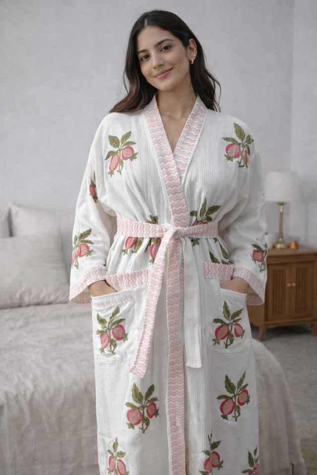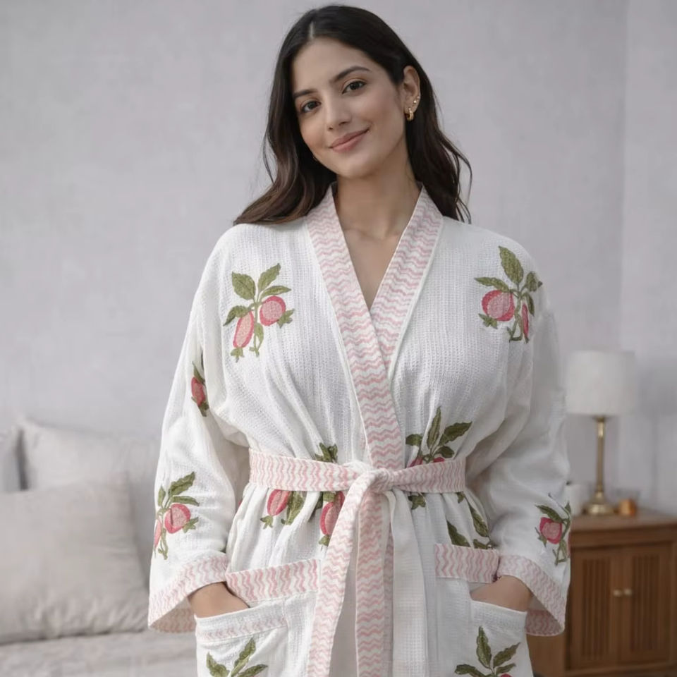 ชุดคลุมอาบน้ำผ้าฝ้ายพิมพ์ลายบล็อคคอตตอนน่ารักสำหรับผู้หญิง