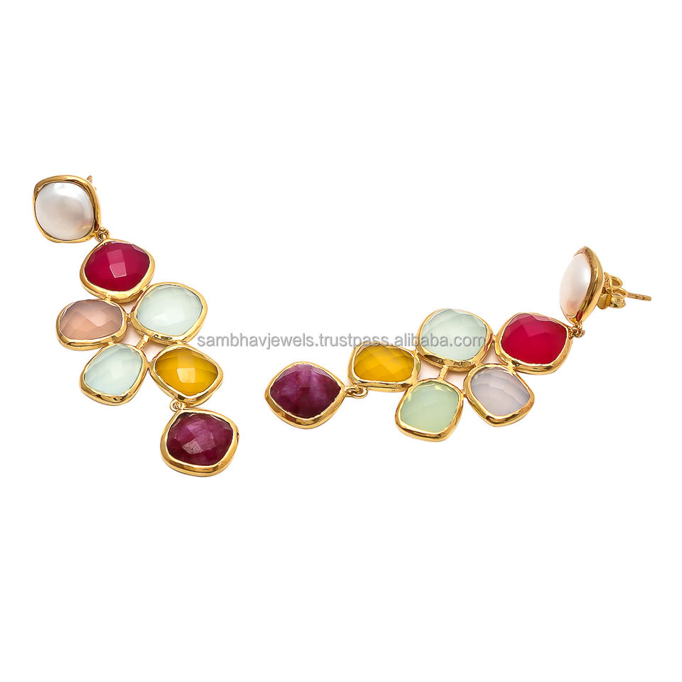 ต่างหูเงินสเตอร์ลิงทำด้วยมือ925แท้ชุบทองอัญมณีหลากสีธรรมชาติแบบห้อยลงสำหรับงานแต่งงานแบบคลาสสิก