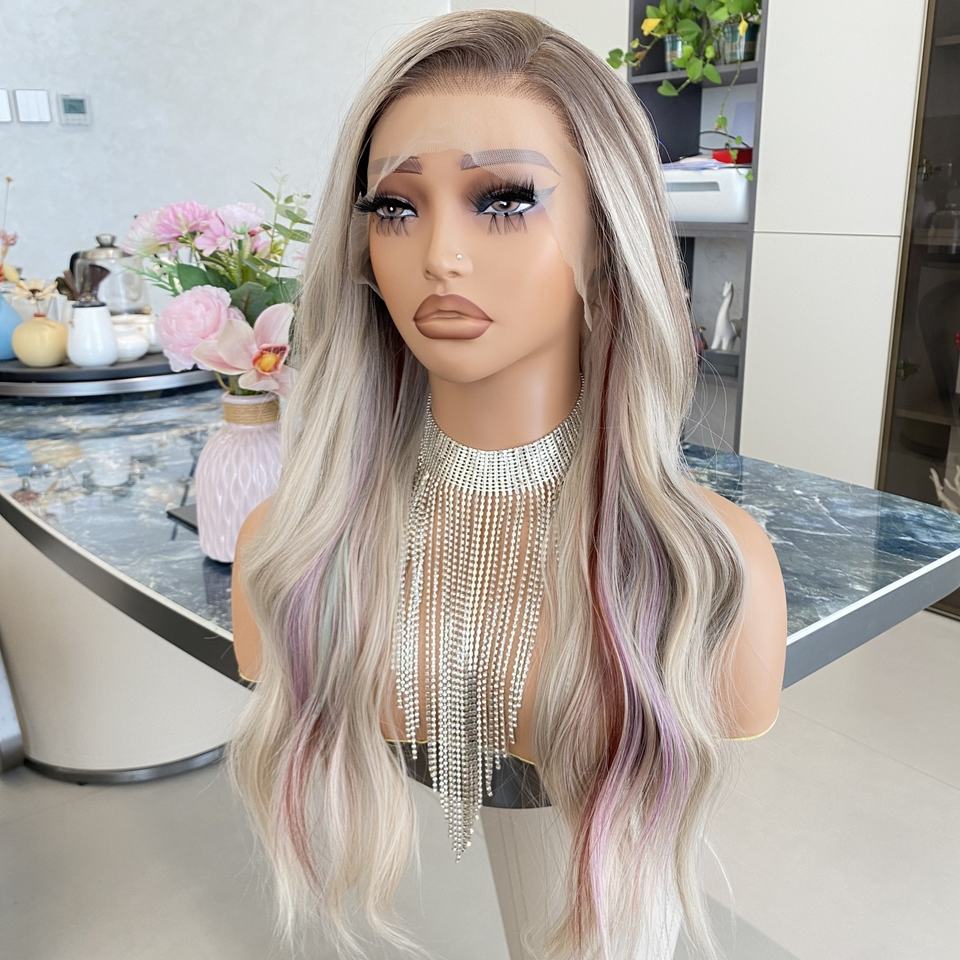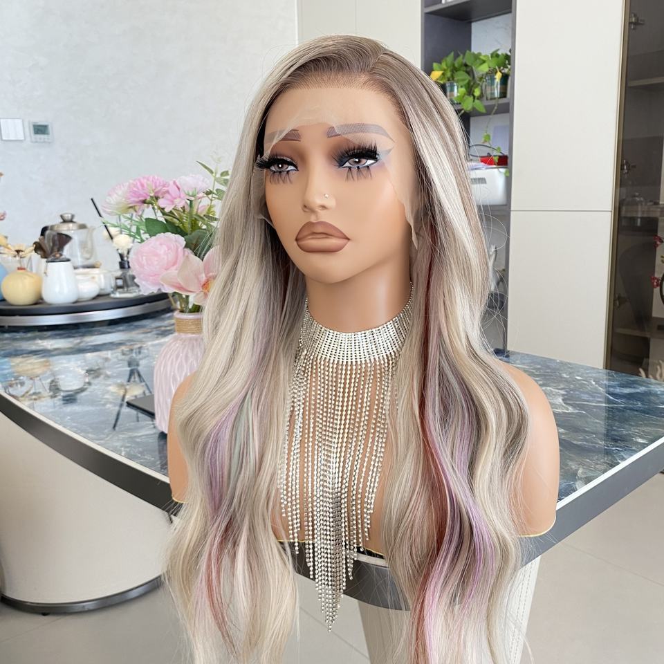 ผู้จำหน่ายวิกผมราคาส่ง วิกผมยาว 20 นิ้ว สีบลอนด์ประกายเทา พร้อมเชือกผูกโปร่งใส วิกผมสังเคราะห์หลากสีรุ้งสำหรับผู้หญิง