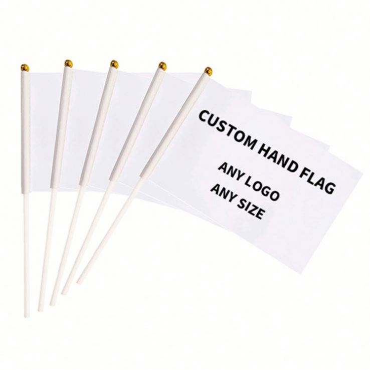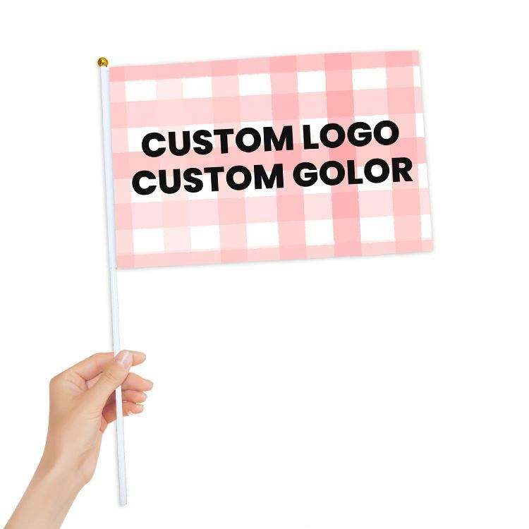 ธงมือถือขนาดเล็กพิมพ์ลายผ้าโพลีเอสเตอร์ขายส่ง พร้อมเสาไม้หรือพลาสติกสำหรับตั้งโชว์ ธงขนาดเล็กสำหรับโบกสะบัด