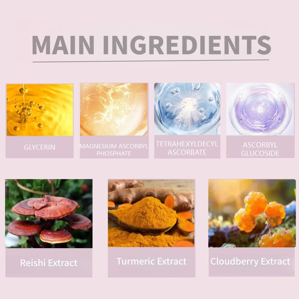 กลีเซอรีน, วิตามินซี, Reishi Extract, Turmeric Extract, Cloudberry Extractส่วนผสมหลัก