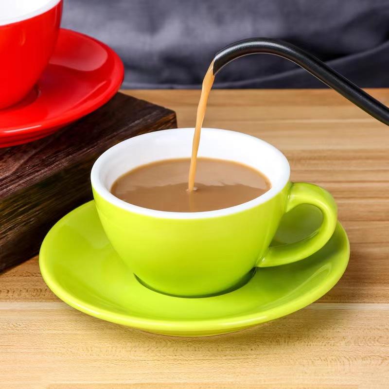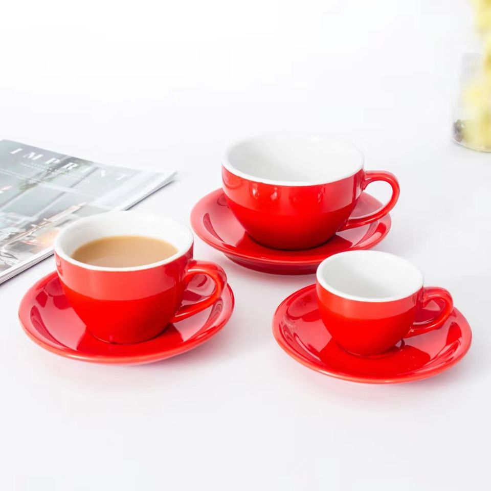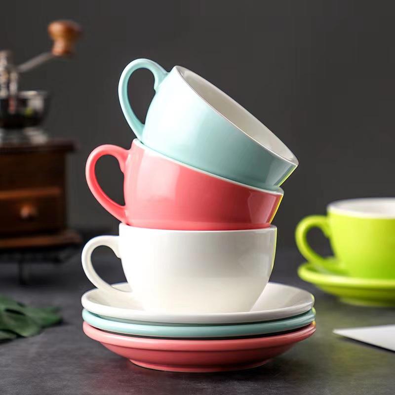 แก้วกาแฟพอร์ซเลนคุณภาพสูงสำหรับขายส่ง ชุดแก้วกาแฟคาปูชิโน่พร้อมจานรอง สีตามสั่ง สำหรับร้านกาแฟ แก้วเคลือบเงา