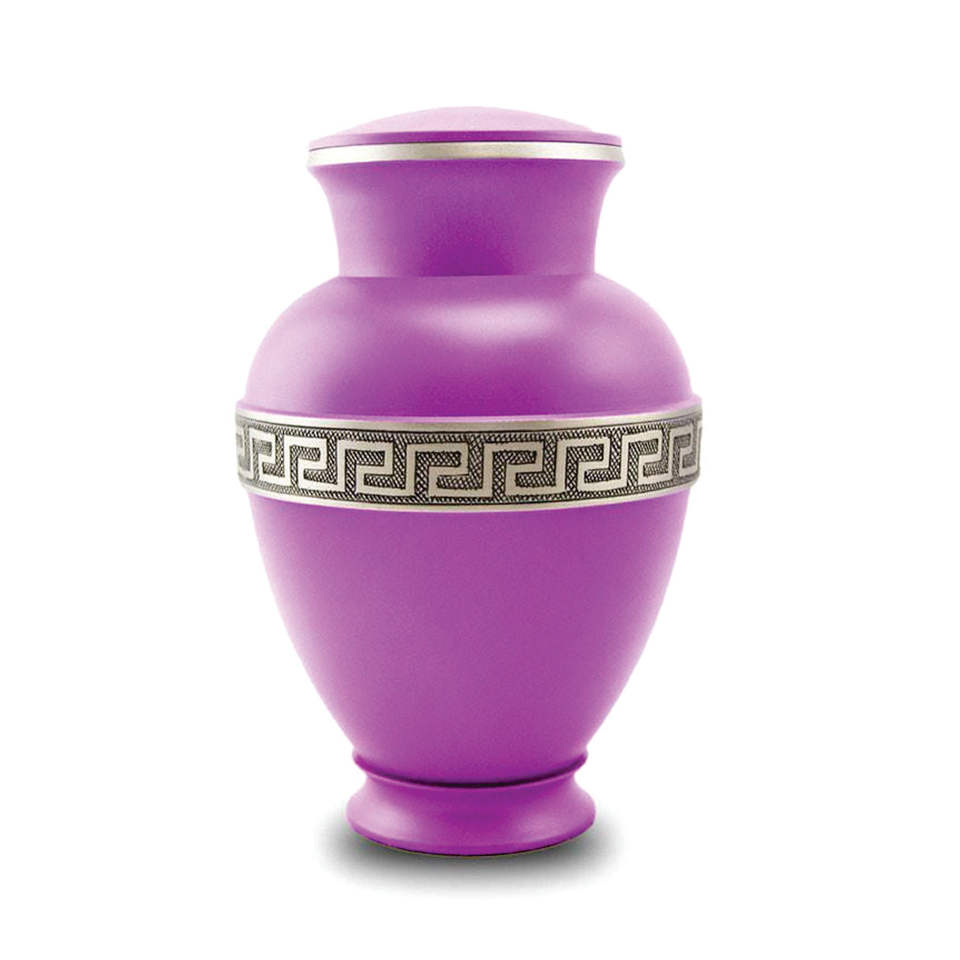 โกศเผาศพอลูมิเนียมสีม่วงสำหรับผู้ใหญ่ขี้เถ้าพร้อมสลักดีไซน์กุญแจกรีกอุปกรณ์งานศพทำมือ