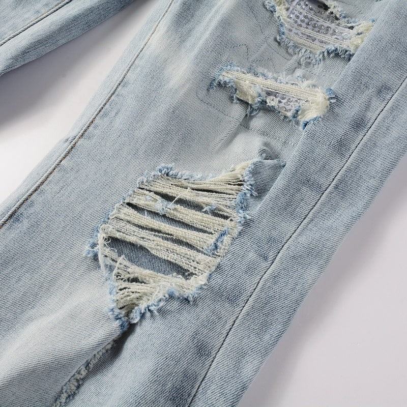 สโตนวอชเข้ารูปสำหรับผู้ชายกางเกงยีนส์ผ้าปักลายไฮสตรีทสำหรับผู้ชายสีม่วง
