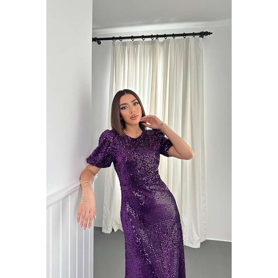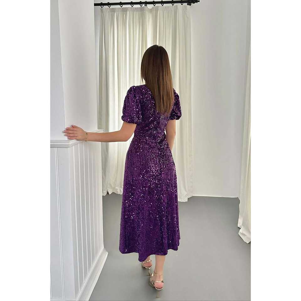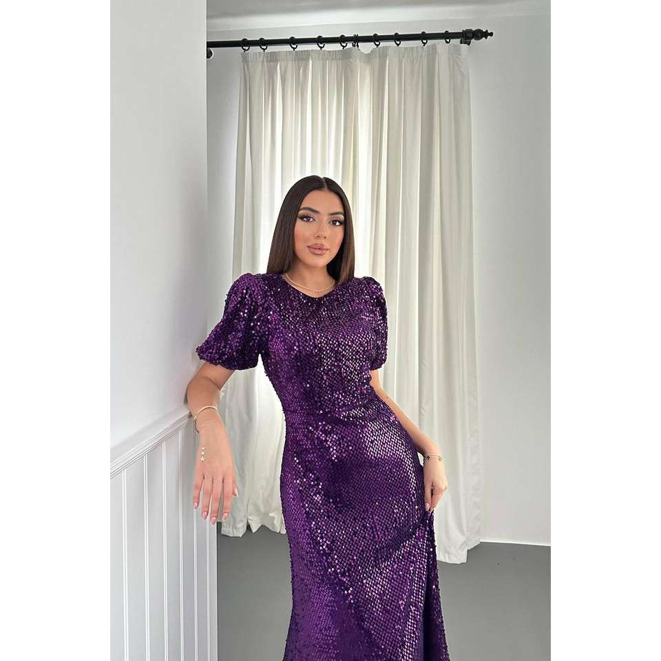 ชุดราตรีสีม่วงประดับเลื่อมขายส่ง