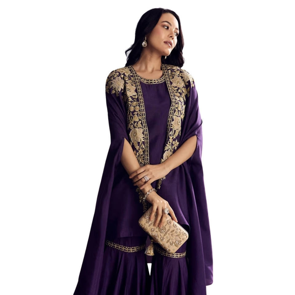 ผ้าคลุมซาริผ้าไหมสีม่วงสำหรับงานแต่งงานงานปาร์ตี้ต้อนรับเทศกาล