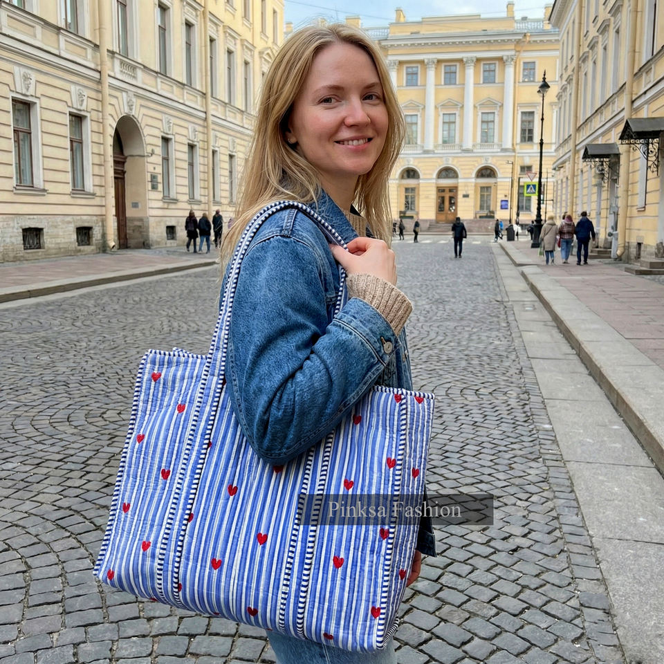 กระเป๋าโท้ทผ้าฝ้ายลายทางสีฟ้าขาวปักลายหัวใจสีแดงแบบขายส่ง รักษ์โลก ใช้ซ้ำได้ น้ำหนักเบา จุของได้เยอะ เหมาะสำหรับช้อปปิ้งและไปทะเล