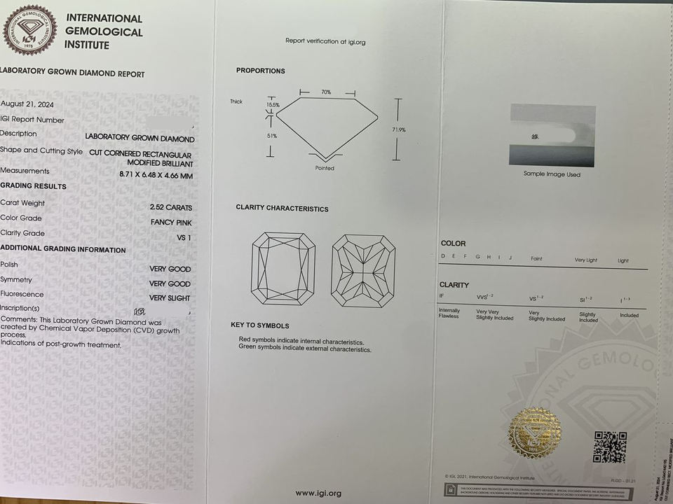 เพชรหลวมสีชมพูแฟนซีเจียระไนแบบเรเดียนท์ 1.9 กะรัต/2.52 กะรัต ผลิตในห้องปฏิบัติการด้วยวิธี HPHT CVD ได้รับการรับรองจาก IGI ความใส VVS เจาะด้วยเลเซอร์ ขายส่ง