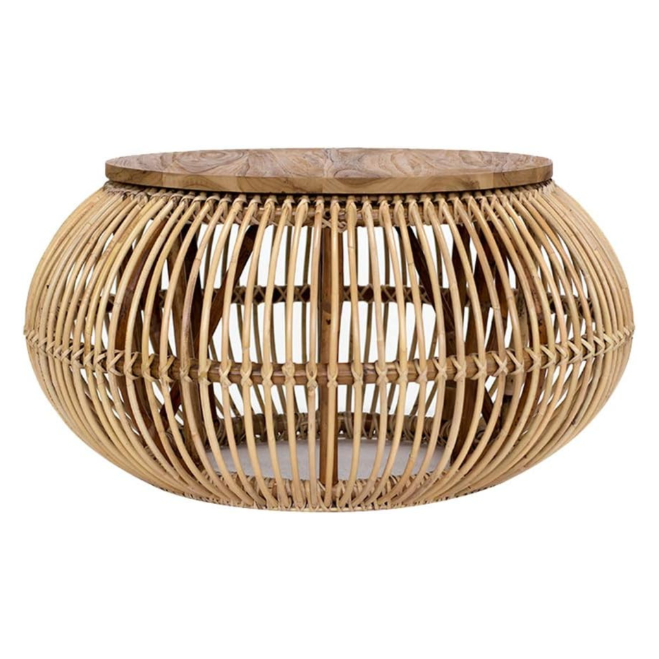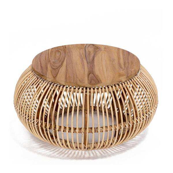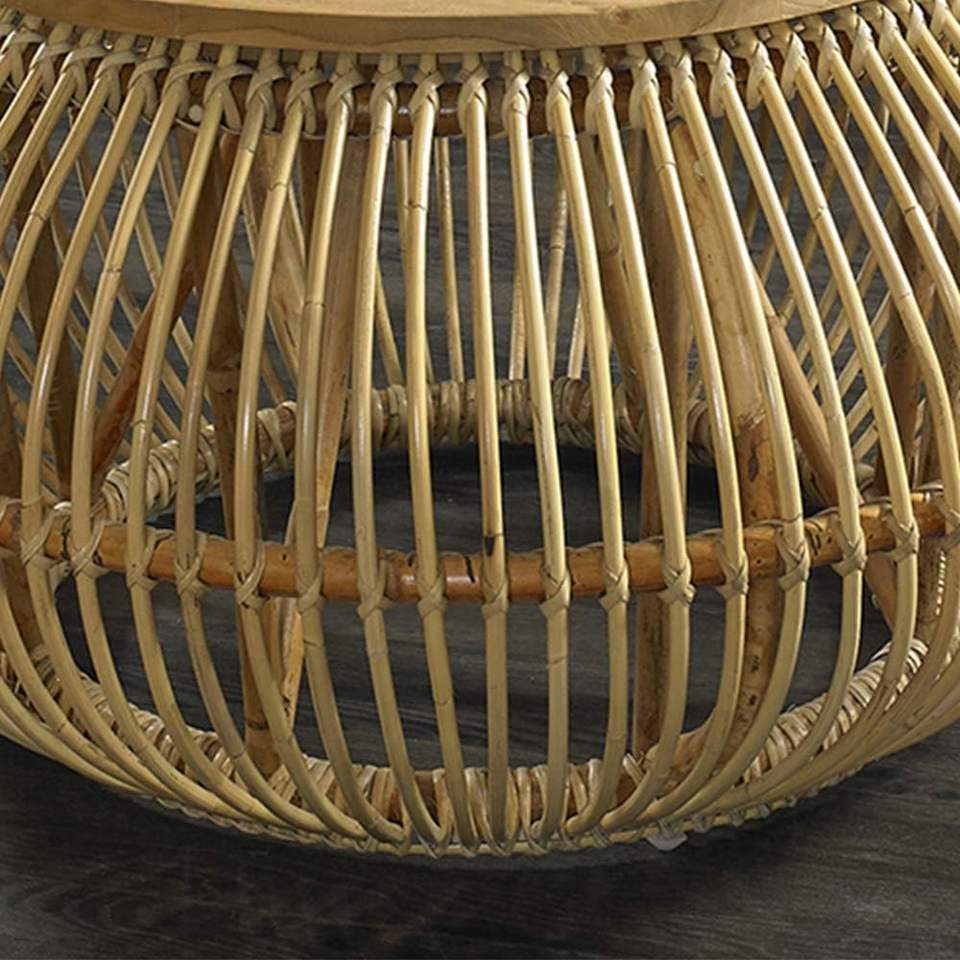 โต๊ะกาแฟทรงกลมหวายธรรมชาติทำมือพร้อมท็อปไม้ - ดีไซน์กรงสานที่เป็นเอกลักษณ์