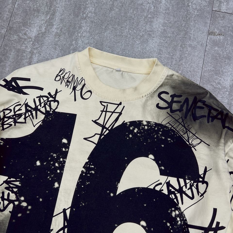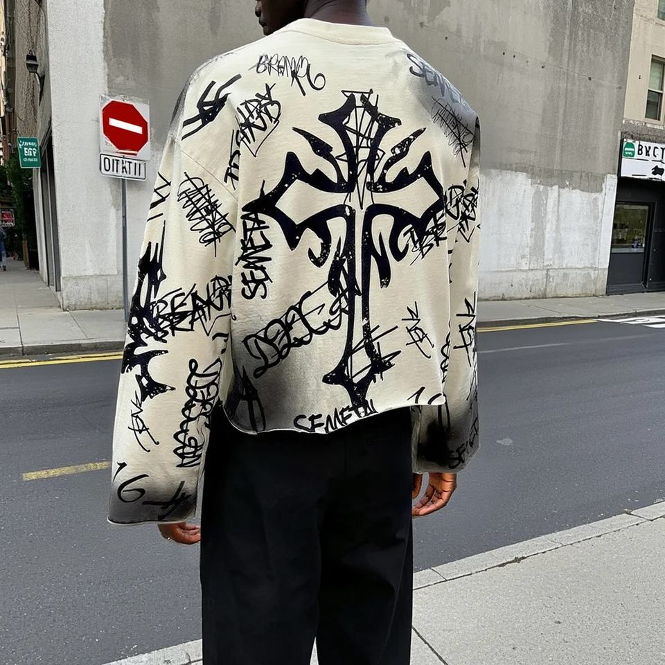 เสื้อยืดครอปสตรีทแวร์ขอบดิบ ดีไซน์เนอร์ พิมพ์ลายกราฟิก หนัก ทรงโอเวอร์ไซส์ แขนยาว ล้างสีแบบแอซิดวอช ขายส่ง