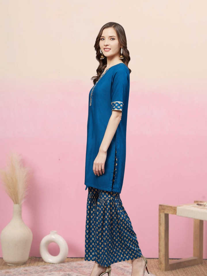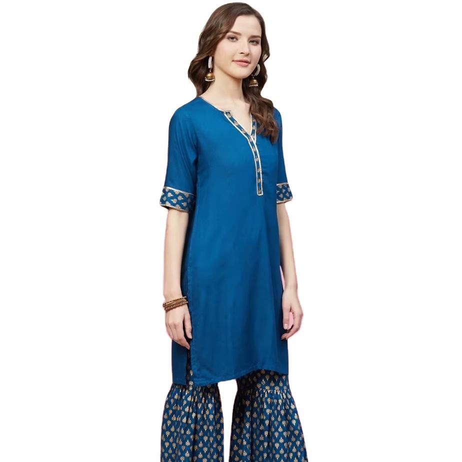 ชุดคุर्ตาชาราร่าผ้าเรยอนพิมพ์ลายทองสำหรับฤดูร้อน ขายส่ง สีฟ้า เสื้อผ้าสตรีแบบดั้งเดิม ป้องกันแสงแดด แห้งเร็ว