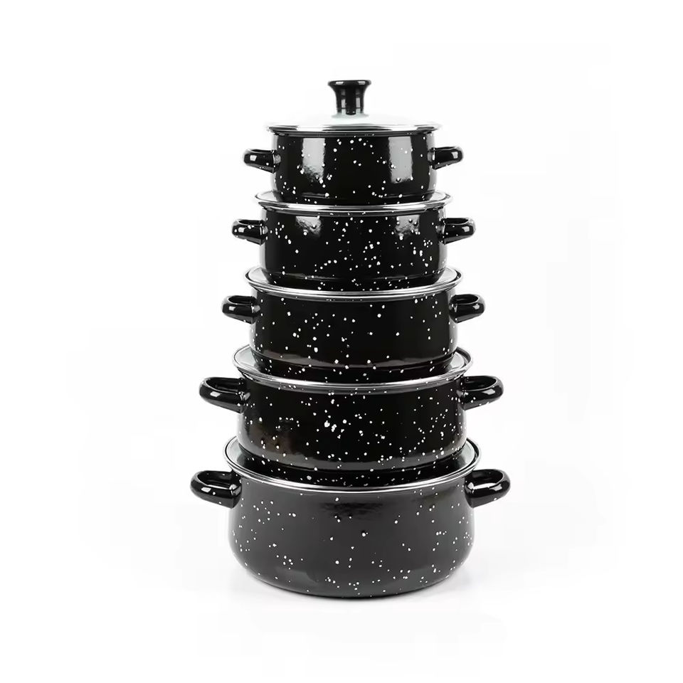 ชุดเครื่องครัวเคลือบอีนาเมลพร้อมส่งขายส่ง 5 ชิ้น ประกอบด้วยหม้อซุป หม้อตุ๋น และดีไซน์หูจับคู่สีดำลายจุด