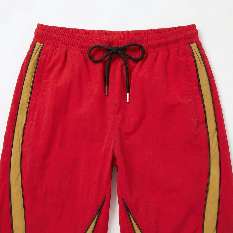Wholesale Red Flame‑Panel Track Pants with Mustard Inset | Cotton‑Blend Casual Joggers | OEM Streetwear & Boutique Supplier