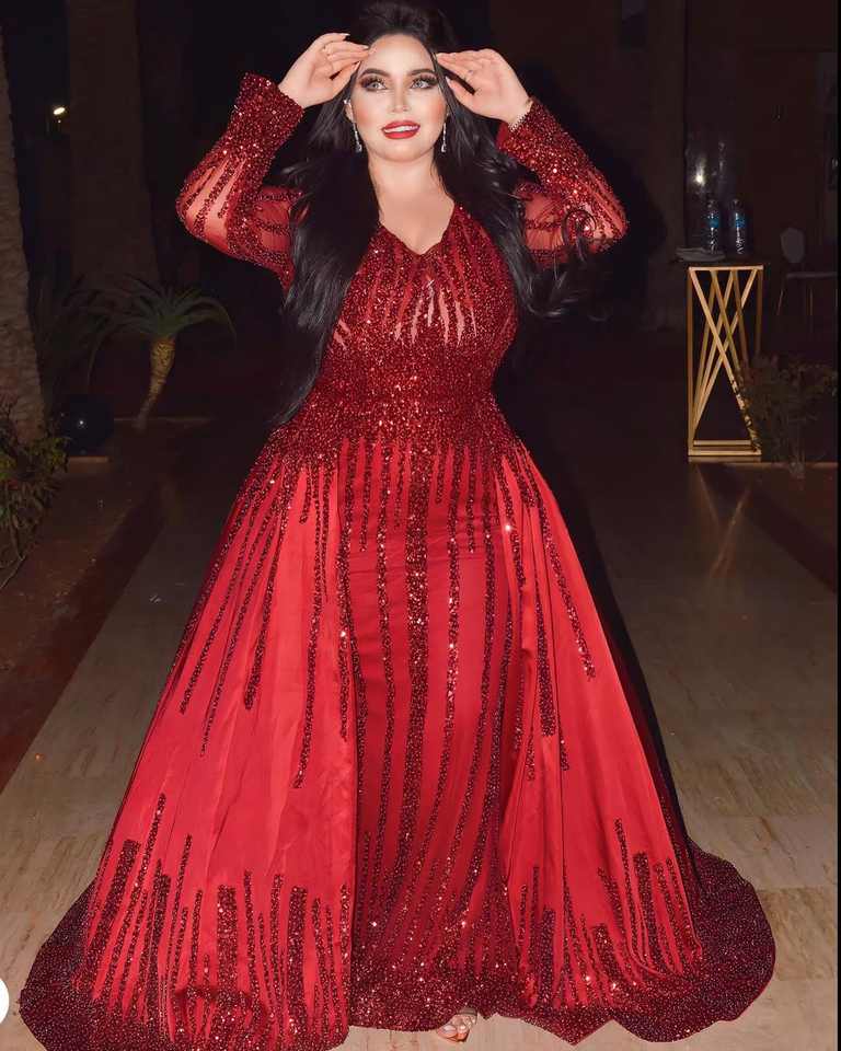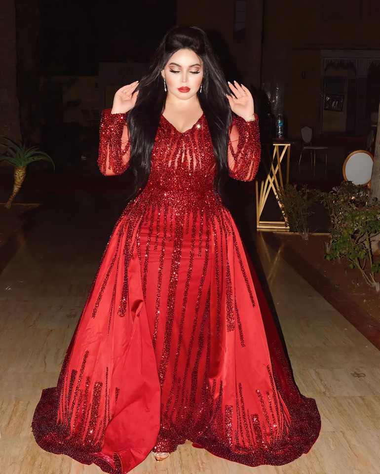 เดรสมุสลิมแบบดั้งเดิมทำด้วยมือสีแดงเข้มสำหรับผู้หญิงสำหรับงานเลี้ยงงานแต่งงานวันเกิดออกแบบมาสำหรับวัฒนธรรมอาหรับ