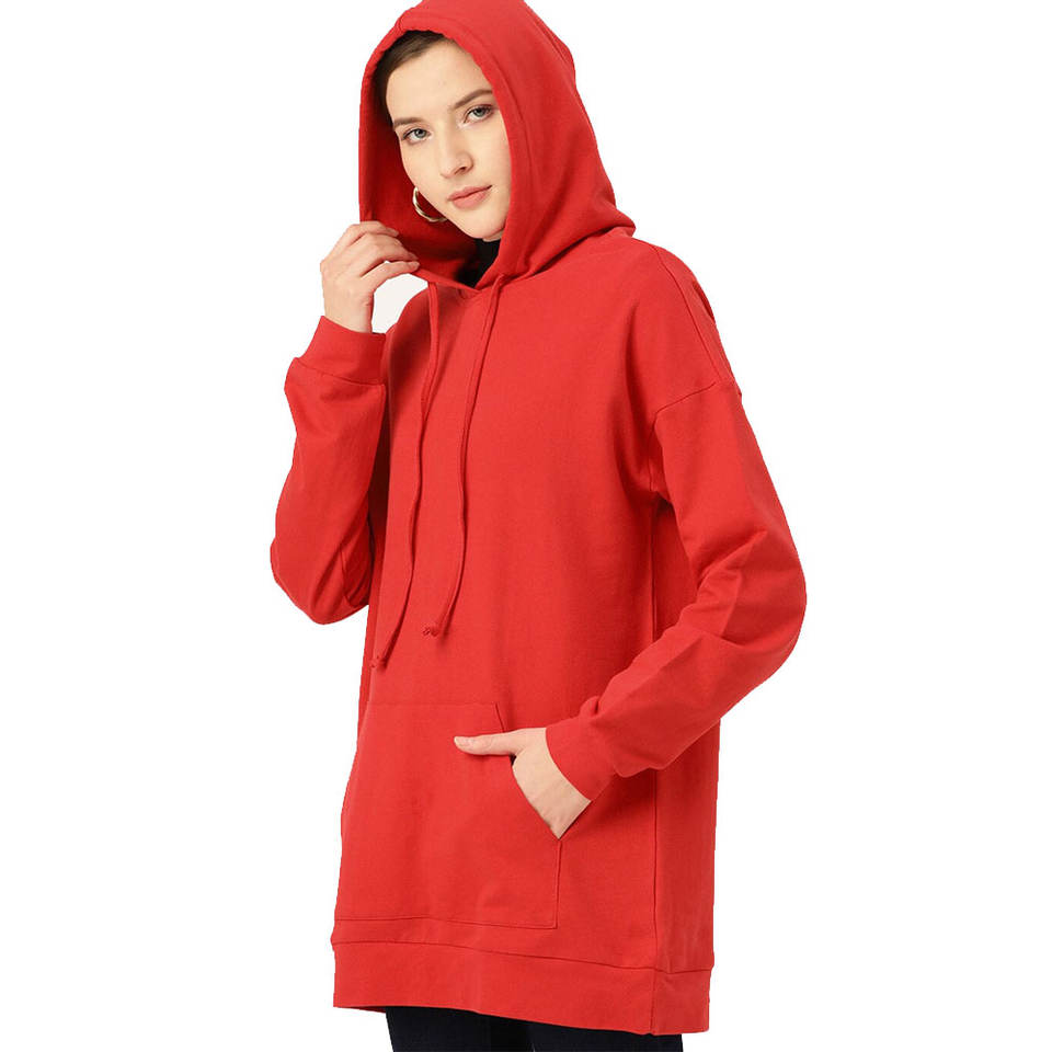 เสื้อฮู้ดดี้ผู้หญิงสีแดงแบบขายส่ง ผ้าฟลีซยาว ทรงมิดิ ตัดเย็บแบบเสื้อคลุม 100% ผ้าฝ้าย ระบายอากาศได้ดี เหมาะสำหรับฤดูหนาว ดีไซน์ด้านหน้า