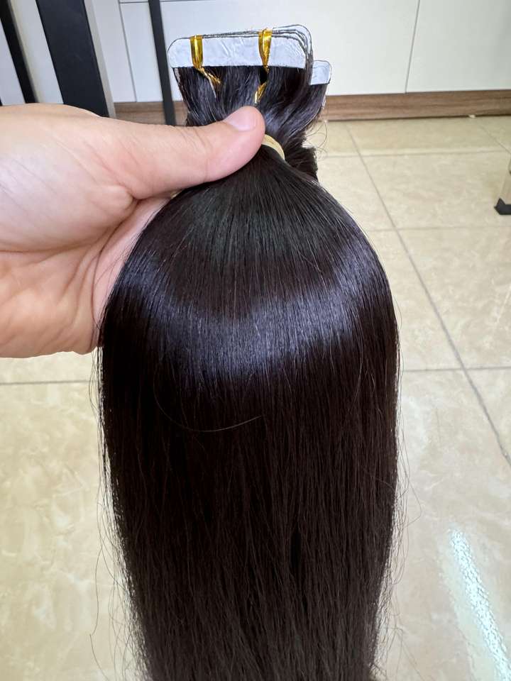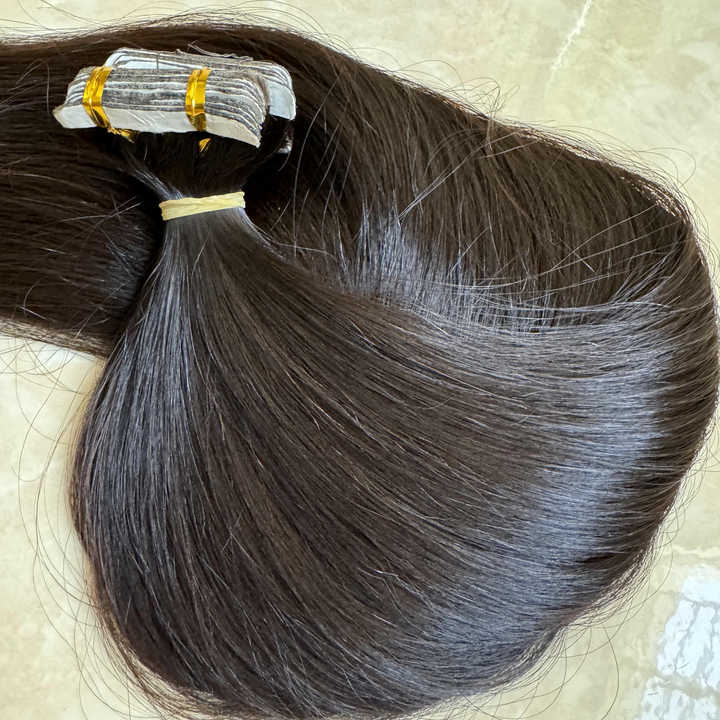 ผมมนุษย์แบบเทปเรมี่สำหรับต่อผมมนุษย์ติดอยู่ในแนวธรรมชาติบริสุทธิ์ตรงและหลวมสไตล์คลื่นลึก