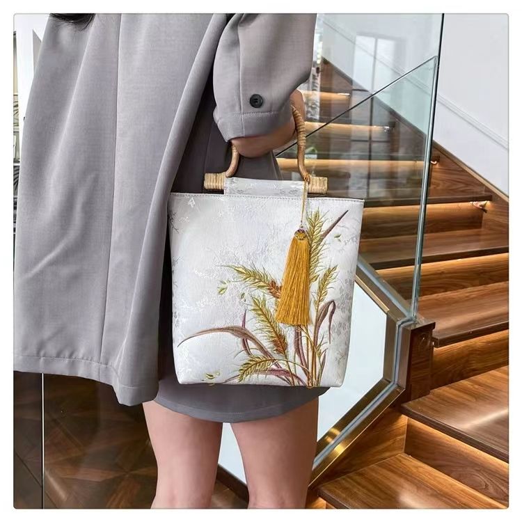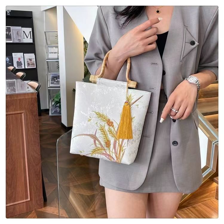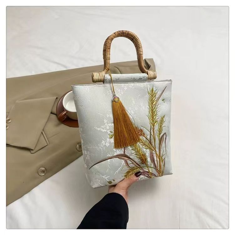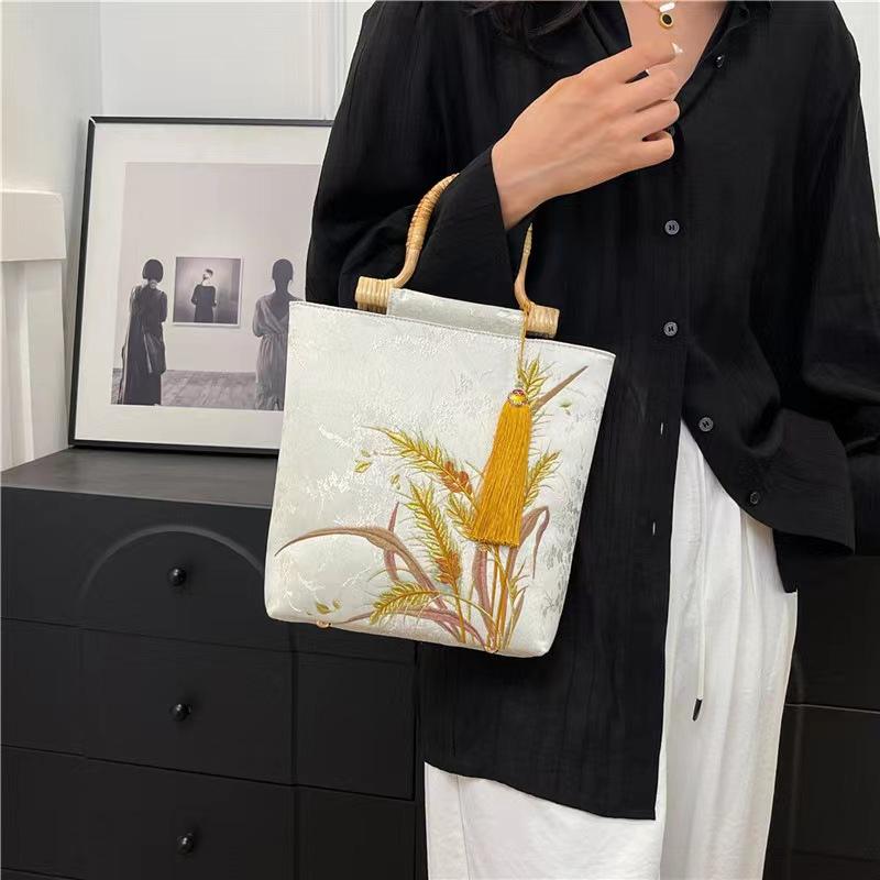 กระเป๋าถือปักลายข้าวสาลีผ้าไหมสไตล์จีนย้อนยุคพร้อมด้ามไม้สำหรับ Hanfu สไตล์จีน