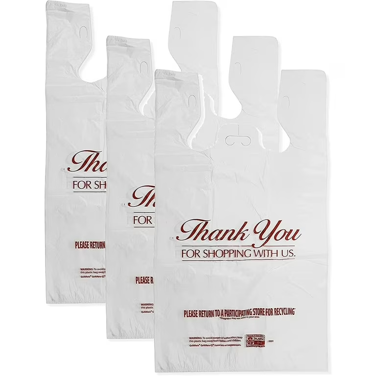 ถุงใส่เสื้อยืดพลาสติกแบบใช้ซ้ำได้พร้อมที่จับเสื้อกั๊กกระเป๋าถือช้อปปิ้งในซูเปอร์มาร์เก็ตพื้นผิวการพิมพ์ลายขอบคุณ