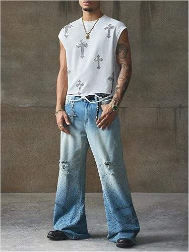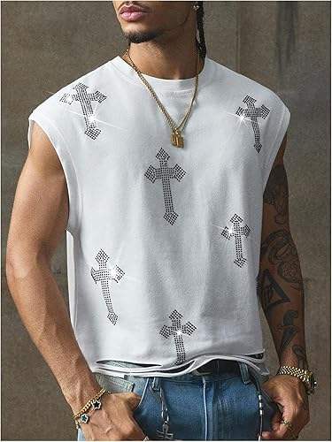 เสื้อยืดแขนกุดลายกราฟิกประดับเพชรขายส่งสำหรับผู้ชาย สไตล์วินเทจสตรีทแวร์ รับทำโลโก้ตามสั่ง โรงงาน OEM