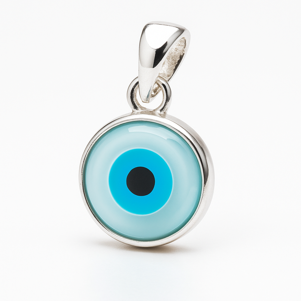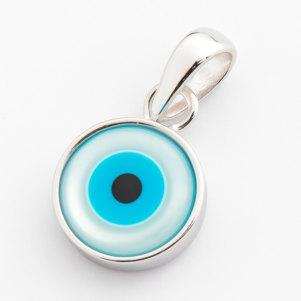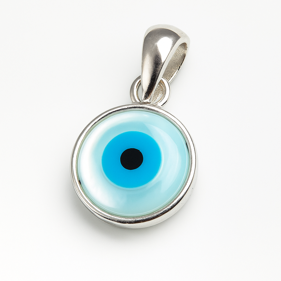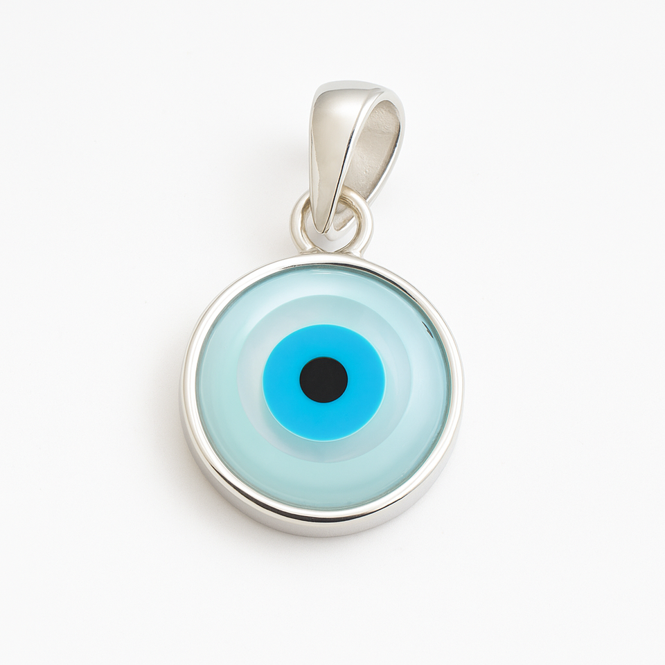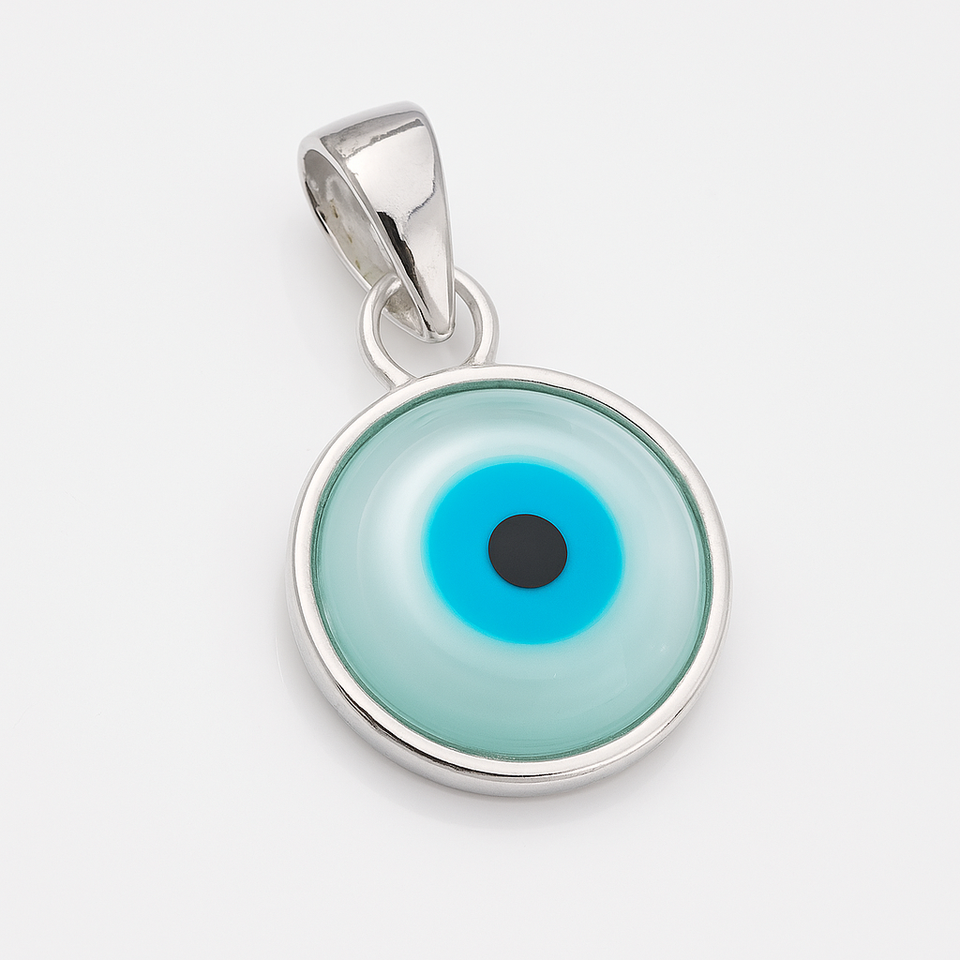 จี้รูปตาปีศาจทรงกลมชุบโรเดียมเงินแท้สำหรับผู้หญิง ขนาด 20x11 มม. จาก Rhaya Jewels สไตล์มินิมอล เรียบหรู เหมาะสำหรับใส่ทุกวัน