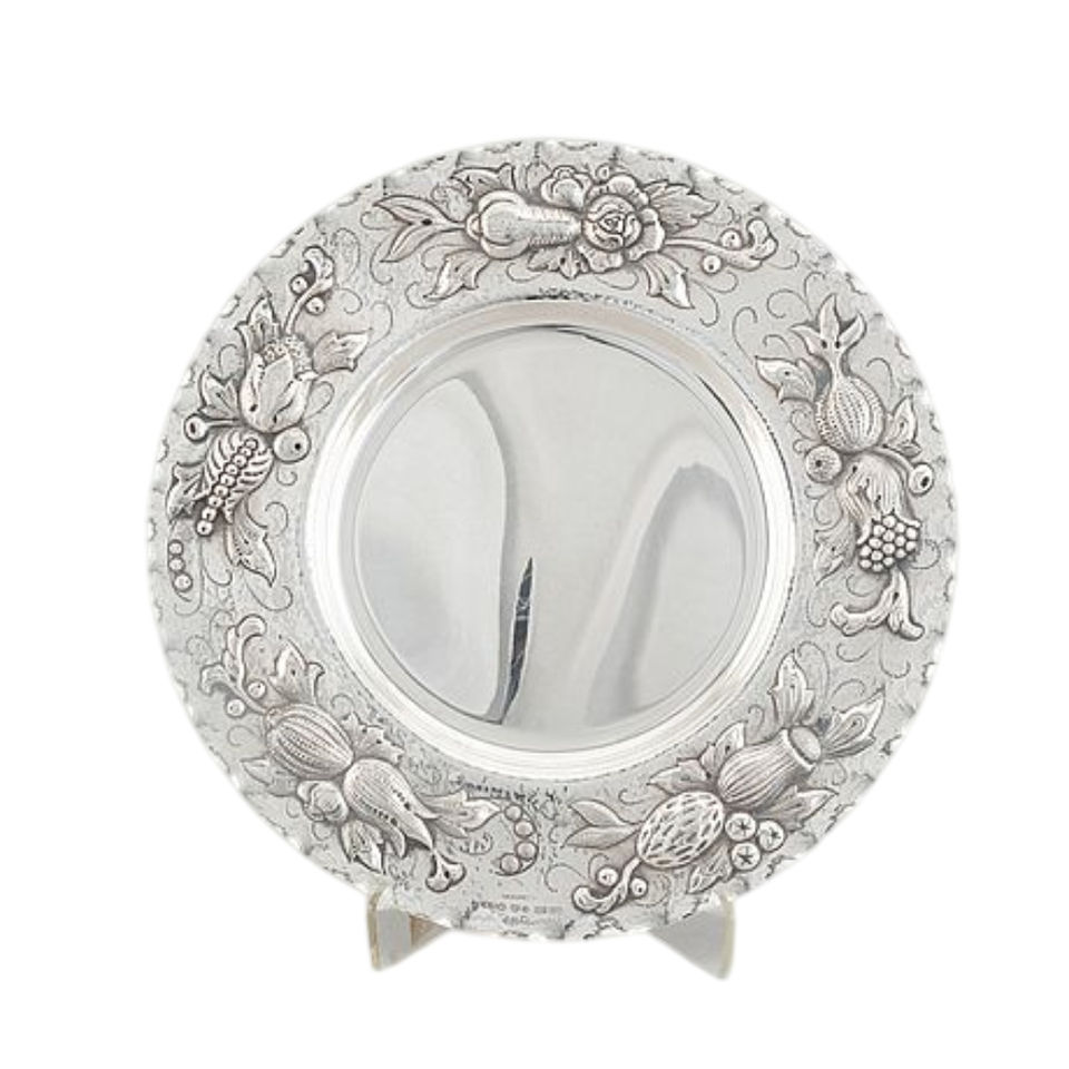จานรองอาหารทรงกลมทำจากทองแดง ดีไซน์ขอบลายนูนดอกไม้ สวยงาม เหมาะสำหรับงานแต่งงานและร้านอาหาร
