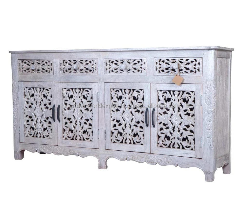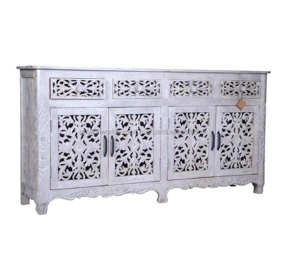 ตู้ไม้โอ๊คเนื้อแข็งลายมะม่วงแบบชนบทตู้เก็บของไม้แกะสลักสีขาวตู้แช่บุฟเฟ่ต์สี่ประตูลิ้นชักห้องครัว