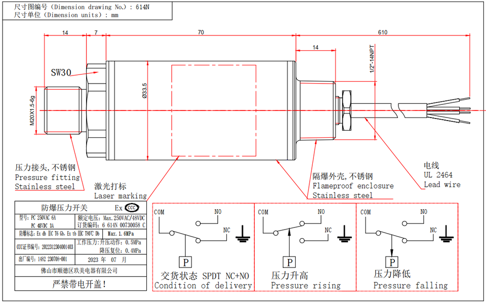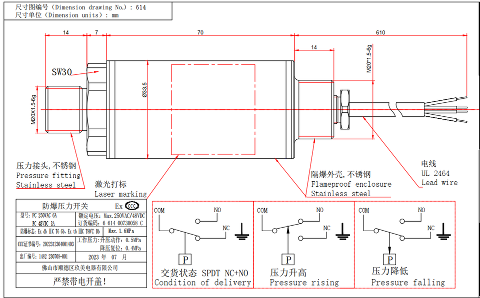 ปั๊มอัดลมแบบสุญญากาศปรับแต่งได้โดยตรงจากโรงงาน SPDT NC สวิตช์ควบคุมแรงดัน ecex CCC cnex สำหรับน้ำ HVAC
