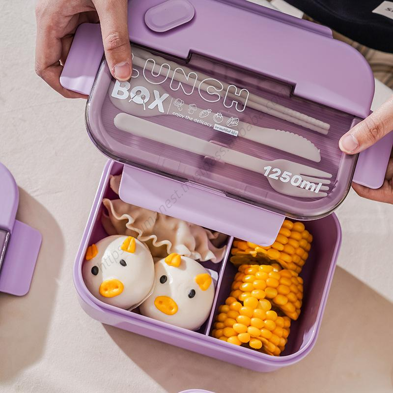 กล่องข้าวพลาสติกสำหรับเด็กนักเรียน SYH701 แบบ 2 ช่อง ขนาด 1250 มล. สำหรับเข้าไมโครเวฟ พร้อมช้อน ตะเกียบ และส้อม สำหรับใส่อาหาร ขายส่ง