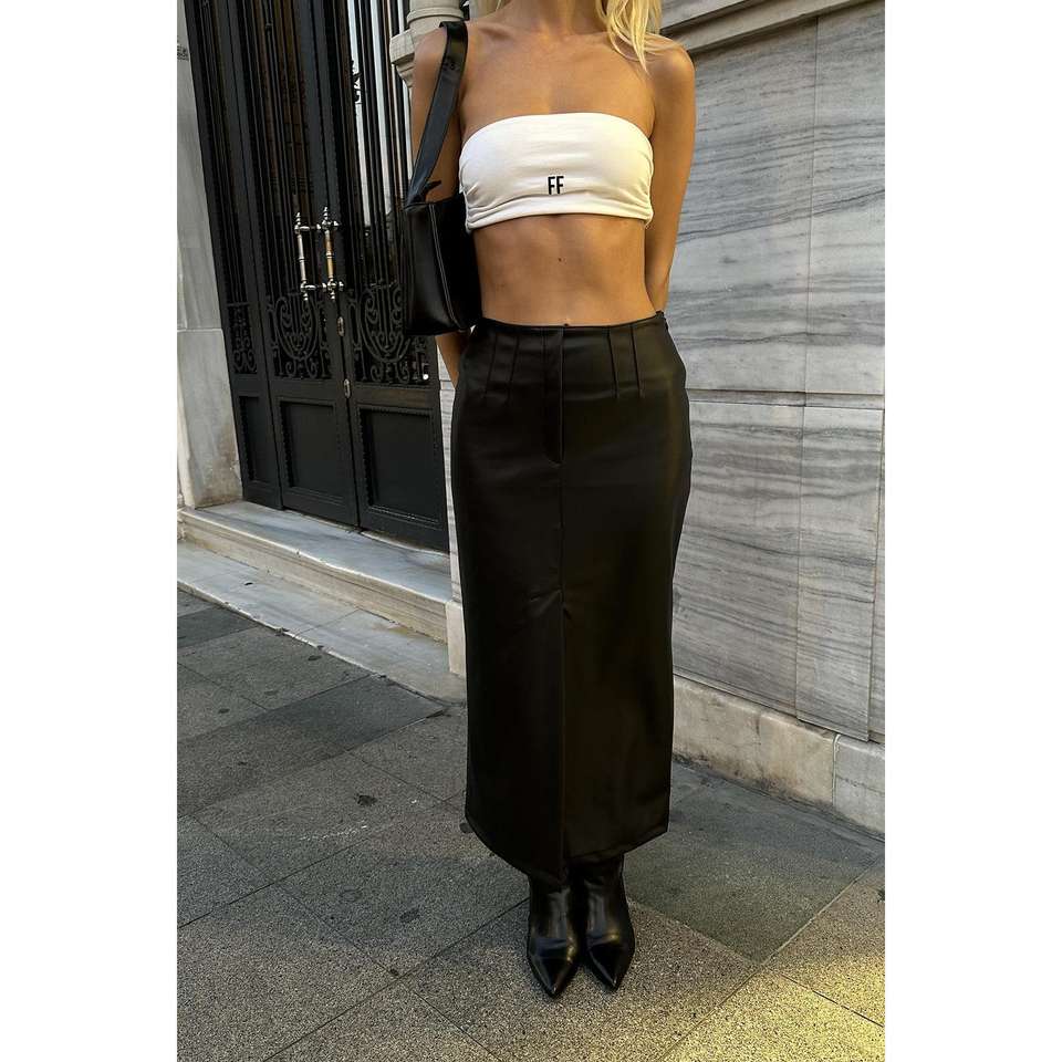 กระโปรงผ้าซาตินสีดำขายส่ง พร้อมดีเทลผ่าข้างเงางามและแถบตกแต่ง